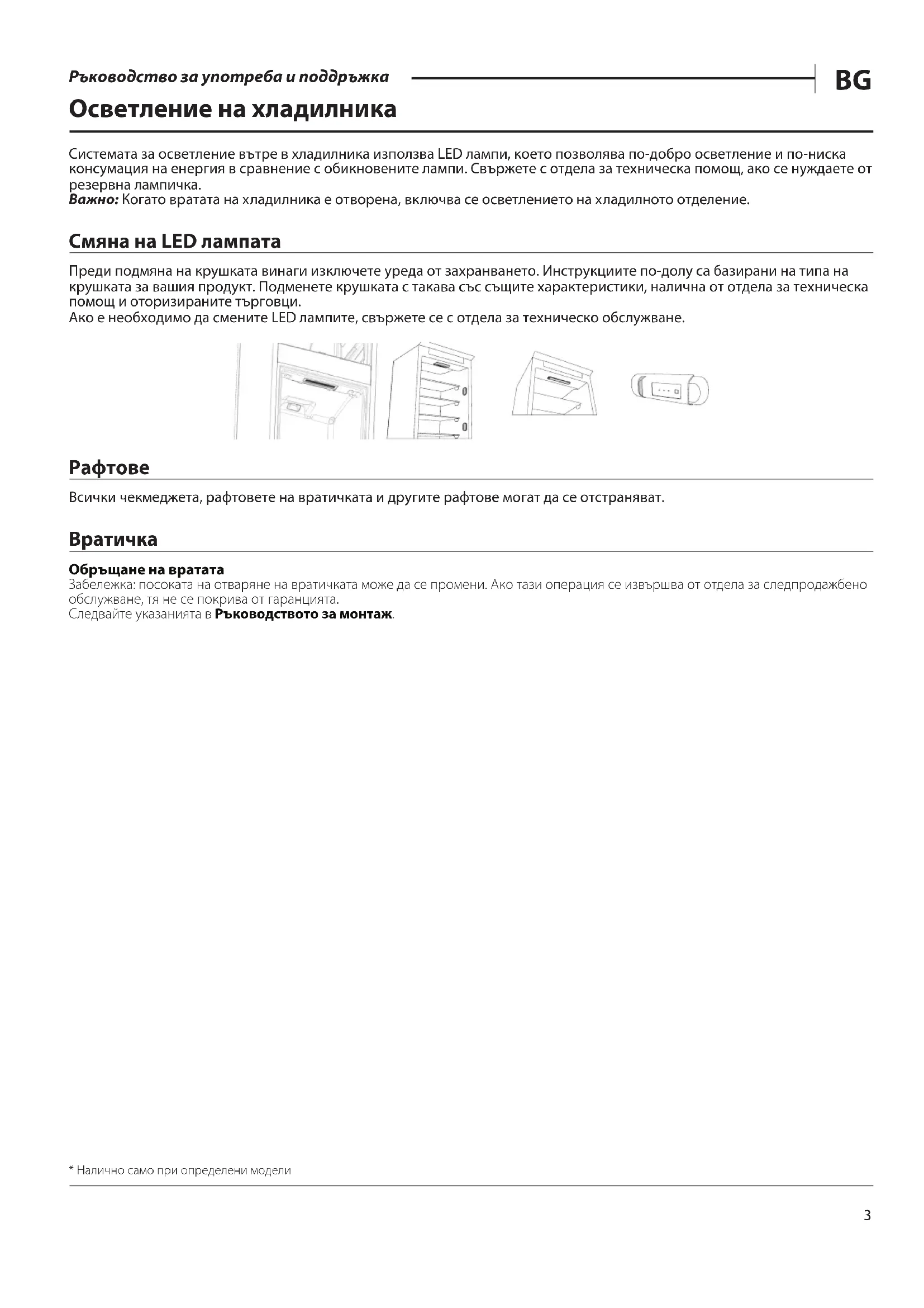 Ръководство за употреба и поддръжка Осветление на хладилника Системата за осветление вътре в хладилника използва LED лампи, което позволява по-добро осветление и по-ниска консумация на енергия в сравнение с обикновените лампи. Свържете с отдела за техническа помощ, ако се нуждаете от резервна лампичка. Важно: Когато вратата на хладилника е отворена, включва се осветлението на хладилното отделение. Смяна на LED лампата Преди подмяна на крушката винаги изключете уреда от захранването. Инструкциите по-долу са базирани на типа на крушката за вашия продукт. Подменете крушката с такава със същите характеристики, налична от отдела за техническа помощ и оторизираните търговци. Ако е необходимо да смените LED лампите, свържете се с отдела за техническо обслужване.