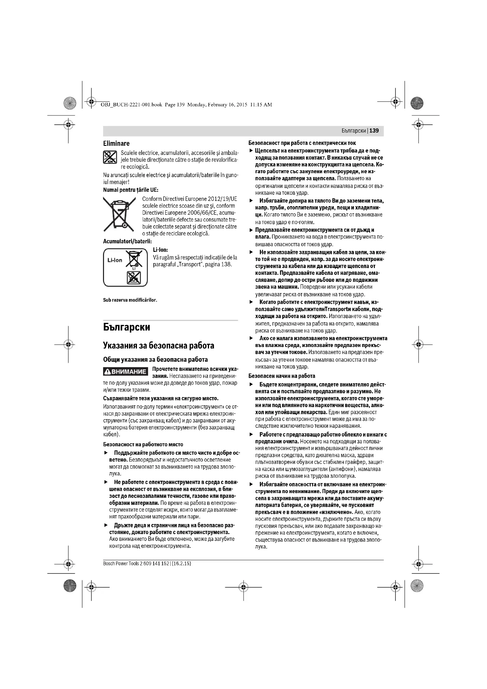 Електроинструментите, акумулаторните батерии и допълнителните приспособления трябва да бъдат предавани за оползотворяване на съдържащите се в тях суровини. Не изхвърляйте електроинструменти и акумулаторни или обикновени батерии при битовите отпадъци! Само за страни от ЕС: Съгласно Европейска директива 2012/19/EC относно излязла от употре- ба електрическа и електронна апаратура и съгласно Европейска директива 2006/66/ЕО обикновени и акумулаторни батерии, които не могат да се използват повече, трябва да се събират отделно и да бъдат подлагани на подходяща преработка за оползотворяване на съдър- жащите се в тях суровини. Акумулаторни или обикновени батерии: Li-Ion: Моля, спазвайте указанията в раз- дел «Транспортиране», страница 145. Правата за изменения запазени.