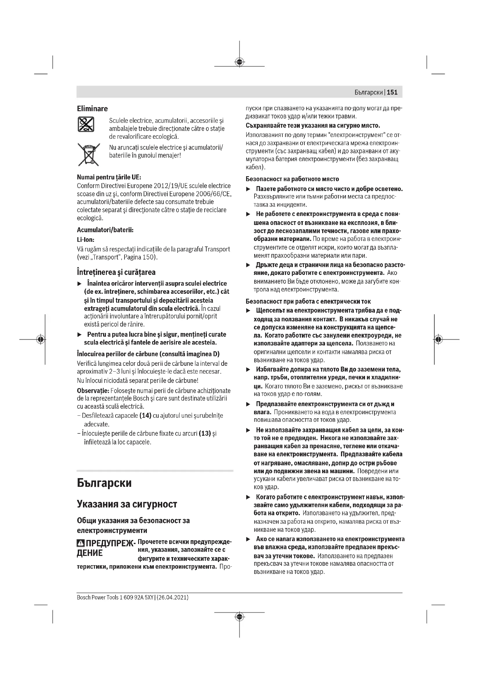 1 609 92A 5XY | (26.04.2021) Bosch Power ToolsБългарски | 153 u За захранване на електроинструментите използ- вайте само предвидените за съответния модел аку- мулаторни батерии. Използването на различни аку- мулаторни батерии може да предизвика трудова зло- полука и/или пожар. u Предпазвайте неизползваните акумулаторни бате- рии от контакт с големи или малки метални предме- ти, напр. кламери, монети, ключове, пирони, винто- ве и др.п., тъй като те могат да предизвикат късо съ- единение. Последствията от късото съединение могат да бъдат изгаряния или пожар. u При неправилно използване от акумулаторна бате- рия от нея може да изтече електролит. Избягвайте контакта с него. Ако въпреки това на кожата Ви по- падне електролит, изплакнете мястото обилно с во- да. Ако електролит попадне в очите Ви, след неза- бавно обилно изплакване потърсете помощ от ле- кар. Електролитът може да предизвика изгаряния на