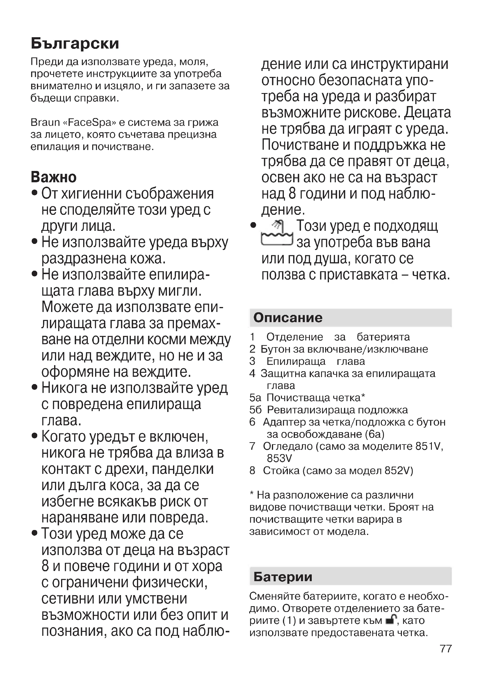 Батериите могат да протекат, ако са изтощени или не се използват дълго време. За да предпазите себе си и уреда, моля, извадете батериите своевременно и избягвайте контакт с кожата при работа с течащи батерии. Батериите за еднократна употреба не трябва да се презареждат. Термина- лите за захранване не трябва да се съединяват на късо. Не смесвайте нови и използвани батерии, както и батерии от различен вид. Епилиране на лицето