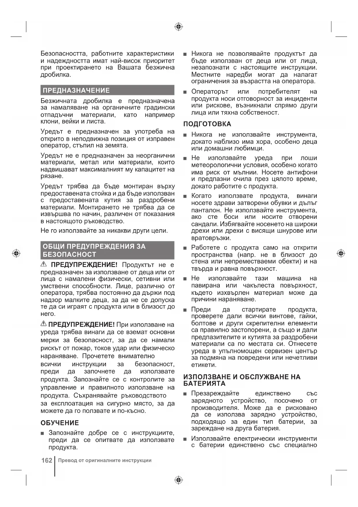 Превод от оригиналните инструкции■ Често наблюдавайте натрупването на надробени материали. ■ Когато кутията за раздробени материали се напълни, изключете уреда, преди да я изпразните. ■ Когато подавате дълги клони/стебла в уреда, внимавайте за вибрации и камшични движения, тъй като те могат да бъдат поети от оператора. Операторът трябва да носи защитни средства за очите винаги когато работи с продукта. ■ Режещият механизъм е направен така, че да придърпва клонки/стебла в уреда. Не задържайте влизането на материал за раздробяване, след като веднъж е захванат. Винаги носете ръкавици, за да предотвратите наранявания на кожата, когато подавате материали за раздробяване към продукта. ■ При обичайна употреба не изключвайте продукта, докато не излезе целият нарязан материал от модула с остриета. Ако продуктът се изключи твърде бързо, оставащите парчета материал може да задръстят модула с остриета и да блокират мотора при повторното включване на продукта. ТРАНСПОРТИРАНЕ И СЪХРАНЕНИЕ ■ Изключете продукта, извадете акумулаторната батерия и изчакайте да се охладят, преди да ги приберете за съхранение или транспортиране. ■ Почистете старателно продукта, преди да го приберете за съхранение на чисто и сухо място, което е недостъпно за
