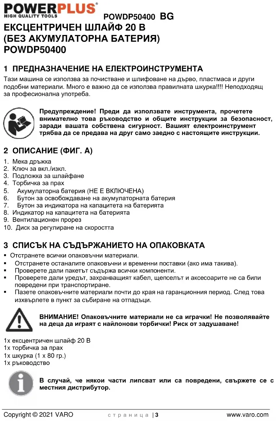 - Обърнете внимание да няма пукнатини или счупвания по подложката преди употреба. Пукнатини или счупвания могат да причинят нараняване на хора.POWDP50400 BG Copyright © 2021 VARO с т р а н и ц а | 7 www.varo.com 7 ДОПЪЛНИТЕЛНИ ИНСТРУКЦИИ ЗА БЕЗОПАСНОСТ ЗА АКУМУЛАТОРНИ БАТЕРИИ И ЗАРЯДНИ УСТРОЙСТВА