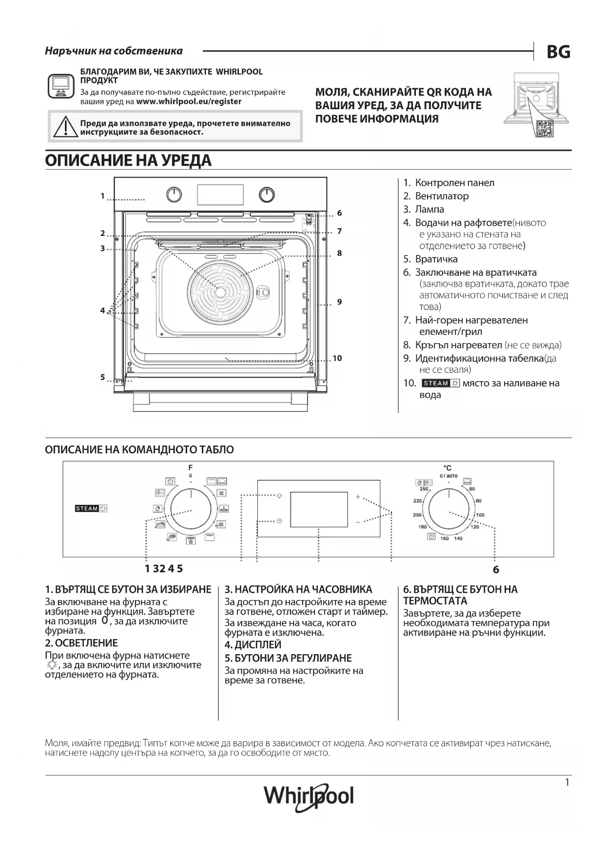 Наръчник на собственика БЛАГОДАРИМ ВИ, ЧЕ ЗАКУПИХТЕ WHIRLPOOL ПРОДУКТЗа да получавате по-пълно съдействие, регистрирайте вашия уред на www . whirlpool . eu/ register МОЛЯ, СКАНИРАЙТЕ QR КОДА НА ВАШИЯ УРЕД, ЗА ДА ПОЛУЧИТЕ ПОВЕЧЕ ИНФОРМАЦИЯ Преди да използвате уреда, прочетете внимателно инструкциите за безопасност. ОПИСАНИЕ НА УРЕДА