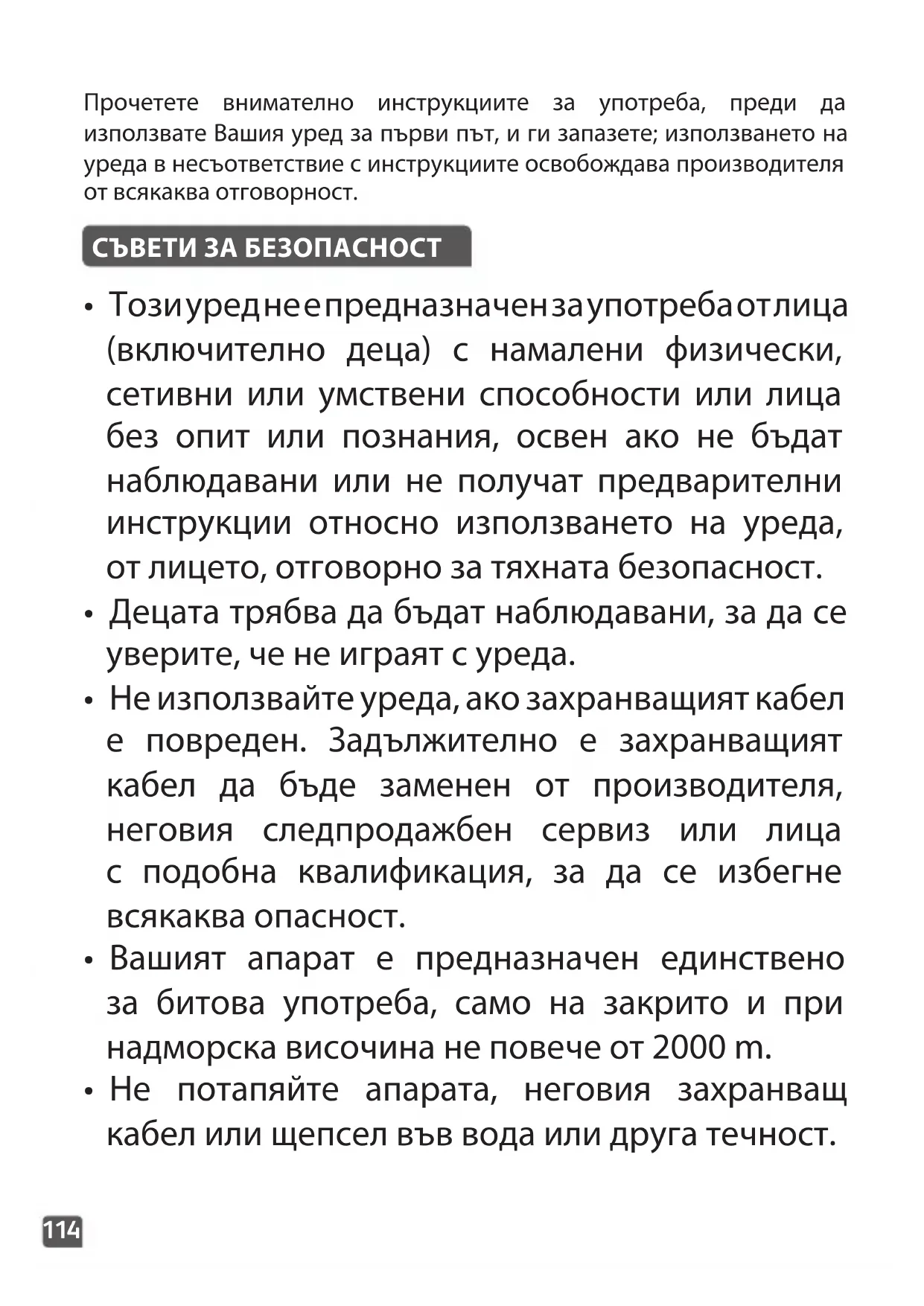 - Не потапяйте апарата, неговия захранващ кабел или щепсел във вода или друга течност. Прочетете внимателно инструкциите за употреба, преди да използвате Вашия уред за първи път, и ги запазете; използването на уреда в несъответствие с инструкциите освобождава производителя от всякаква отговорност.115