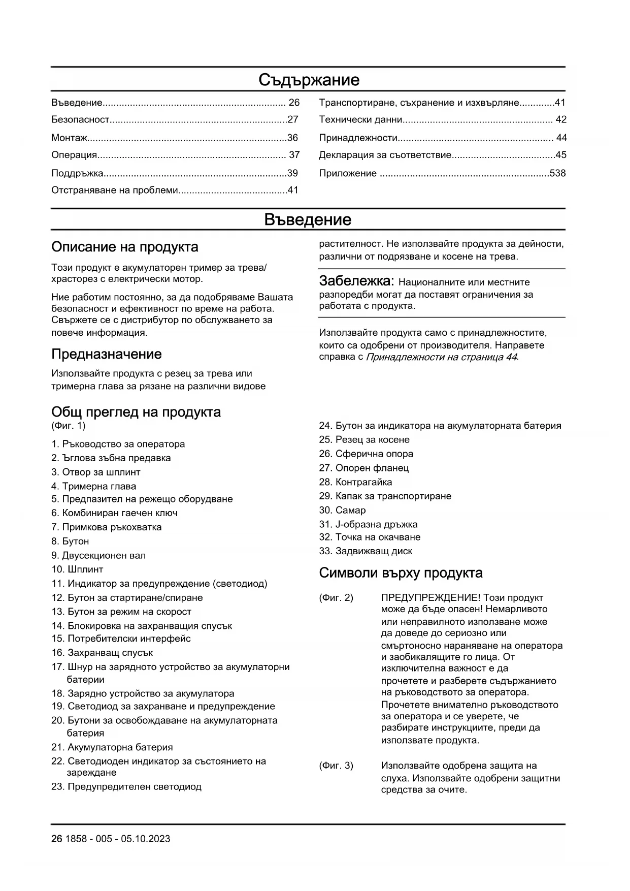 Описание на продукта Този продукт е акумулаторен тример за трева/ храсторез с електрически мотор. Ние работим постоянно, за да подобряваме Вашата безопасност и ефективност по време на работа. Свържете се с дистрибутор по обслужването за повече информация. Предназначение Използвайте продукта с резец за трева или тримерна глава за рязане на различни видове растителност. Не използвайте продукта за дейности, различни от подрязване и косене на трева. Забележка: Националните или местните разпоредби могат да поставят ограничения за работата с продукта. Използвайте продукта само с принадлежностите, които са одобрени от производителя. Направете