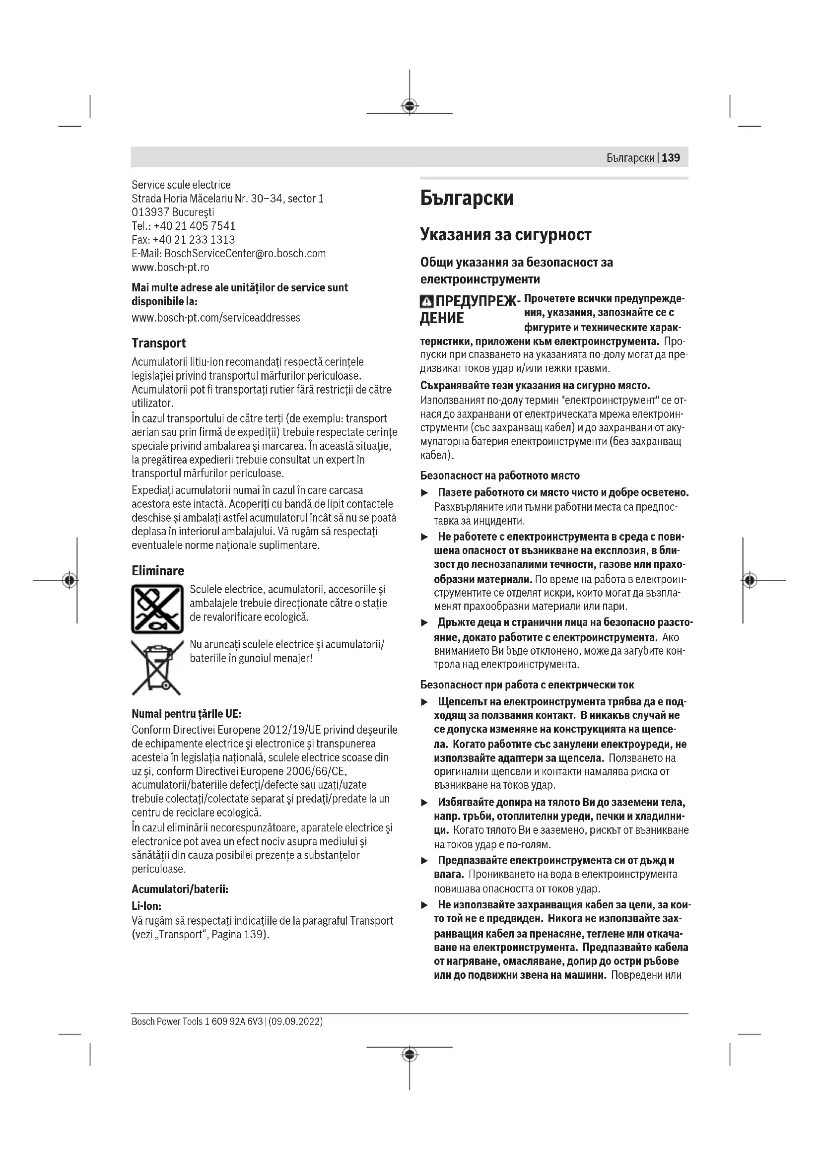 Електроинструментите, акумулаторните ба- терии и допълнителните приспособления трябва да бъдат предавани за оползотворя- ване на съдържащите се в тях суровини. Не изхвърляйте електроинструменти и аку- мулаторни или обикновени батерии при би- товите отпадъци! Само за страни отЕС: Съгласно европейска директива 2012/19/EС за старите електрически и електронни уреди и нейното транспорти- Bosch Power Tools 1 609 92A 6V3 | (09.09.2022)146 | Македонски ране в националното право електроинструменти, които не могат да се ползват повече, а съгласно европейска ди- ректива 2006/66/EО повредени или изхабени обикнове- ни или акумулаторни батерии, трябва да се събират и предават за оползотворяване на съдържащите се в тях су-