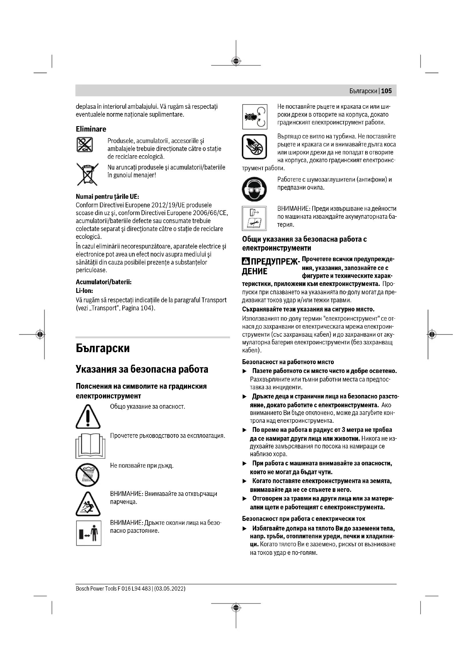 Безопасност на работното място u Пазете работното си място чисто и добре осветено. Разхвърляните или тъмни работни места са предпос- тавка за инциденти. u Дръжте деца и странични лица на безопасно разсто- яние, докато работите с електроинструмента. Ако вниманието Ви бъде отклонено, може да загубите кон- трола над електроинструмента. u По време на работа в радиус от 3 метра не трябва да се намират други лица или животни. Никога не из- духвайте замърсявания по посока на намиращи се наблизо хора. u При работа с машината внимавайте за опасности, които не могат да бъдат чути. u Когато поставяте електроинструмента на земята, внимавайте да не се спънете в него. u Отговорен за травми на други лица или за матери- ални щети е работещият с електроинструмента. Безопасност при работа с електрически ток u Избягвайте допира на тялото Ви до заземени тела, напр. тръби, отоплителни уреди, печки и хладилни- ци. Когато тялото Ви е заземено, рискът от възникване на токов удар е по‑голям. Bosch Power Tools F 016 L94 483 | (03.05.2022)106 | Български u Предпазвайте електроинструмента от дъжд и ов- лажняване. Проникването на вода в електроинстру- мента повишава опасността от токов удар. u Избягвайте работа в лошо време, особено при предстояща буря. Безопасен начин на работа u Бъдете концентрирани, следете внимателно дейст- вията си и постъпвайте предпазливо и разумно. Не използвайте електроинструмента, когато сте умо- рени или под влиянието на наркотични вещества, алкохол или упойващи лекарства. Един миг разсея- ност при работа с електроинструмент може да има за последствие изключително тежки наранявания. u Работете с предпазващо работно облекло. Винаги носете предпазни очила. Носенето на подходящи за ползвания електроинструмент и извършваната дей- ност лични предпазни средства, като дихателна маска, здрави плътнозатворени обувки със стабилен грай- фер, защитна каска или шумозаглушители (антифо- ни), намалява риска от възникване на трудова злопо-