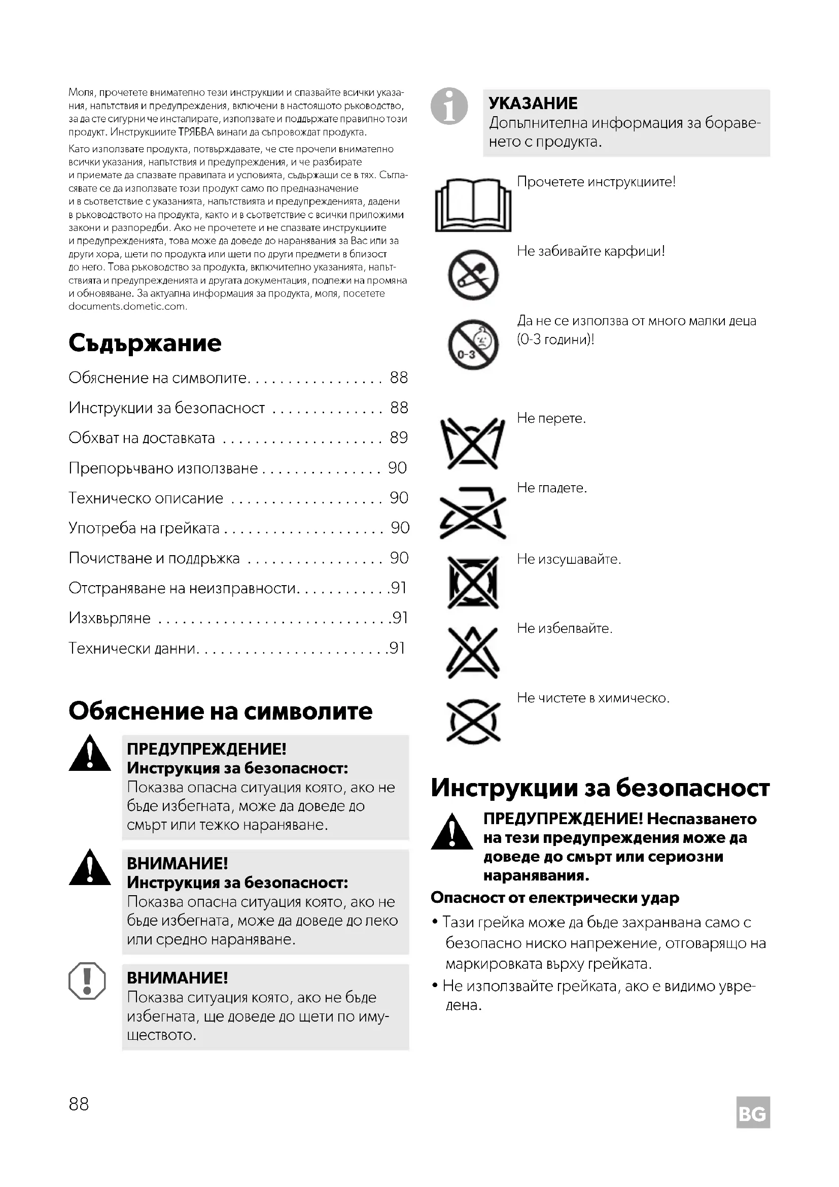ПРЕДУПРЕЖДЕНИЕ! Инструкция за безопасност: Показва опасна ситуация която, ако не бъде избегната, може да доведе до смърт или тежко нараняване.