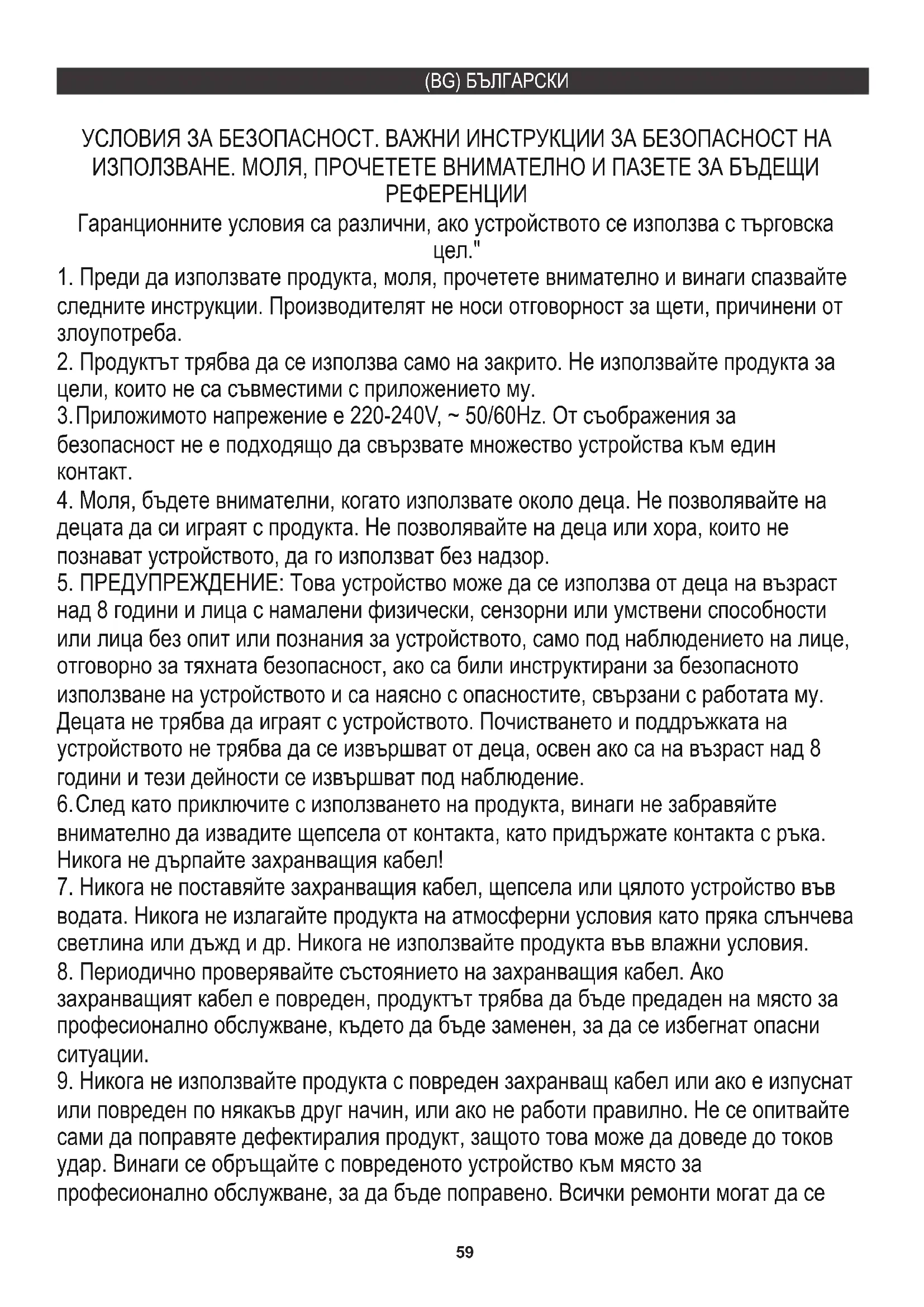 над 8 години и лица с намалени физически, сензорни или умствени способности или лица без опит или познания за устройството, само под наблюдението на лице, отговорно за тяхната безопасност, ако са били инструктирани за безопасното използване на устройството и са наясно с опасностите, свързани с работата му. Децата не трябва да играят с устройството. Почистването и поддръжката на устройството не трябва да се извършват от деца, освен ако са на възраст над 8 години и тези дейности се извършват под наблюдение. (BG) БЪЛГАРСКИ 5912. Не оставяйте кабела да виси над ръба на плота или да докосва горещи повърхности. извършват само от оторизирани сервизни специалисти. Ремонтът, който е извършен неправилно, може да доведе до опасни ситуации за потребителя.