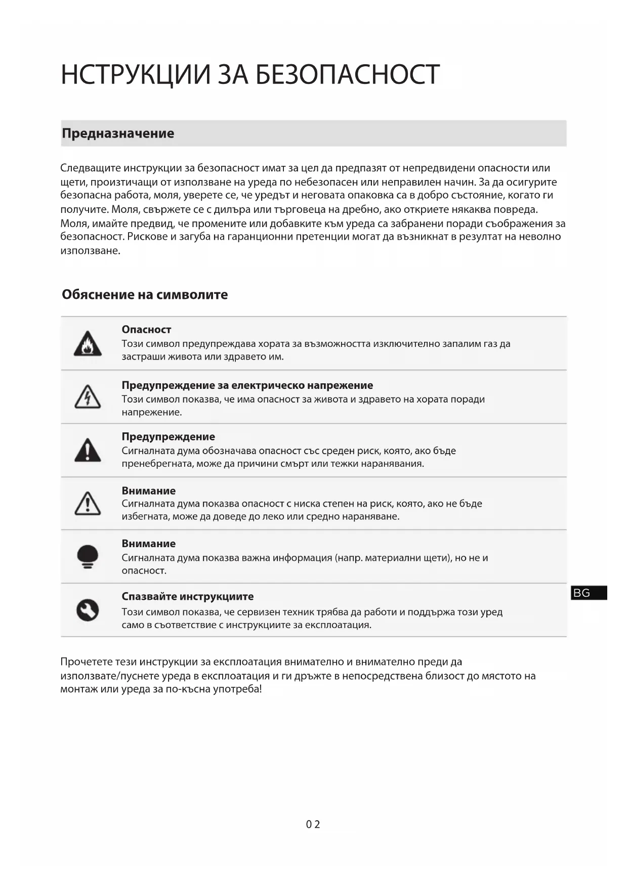 BGНСТРУКЦИИ ЗА БЕЗОПАСНОСТ Предназначение Следващите инструкции за безопасност имат за цел да предпазят от непредвидени опасности или щети, произтичащи от използване на уреда по небезопасен или неправилен начин. За да осигурите безопасна работа, моля, уверете се, че уредът и неговата опаковка са в добро състояние, когато ги получите. Моля, свържете се с дилъра или търговеца на дребно, ако откриете някаква повреда. Моля, имайте предвид, че промените или добавките към уреда са забранени поради съображения за безопасност. Рискове и загуба на гаранционни претенции могат да възникнат в резултат на неволно използване. Обяснение на символите Oпасност Предупреждение за електрическо напрежение Предупреждение