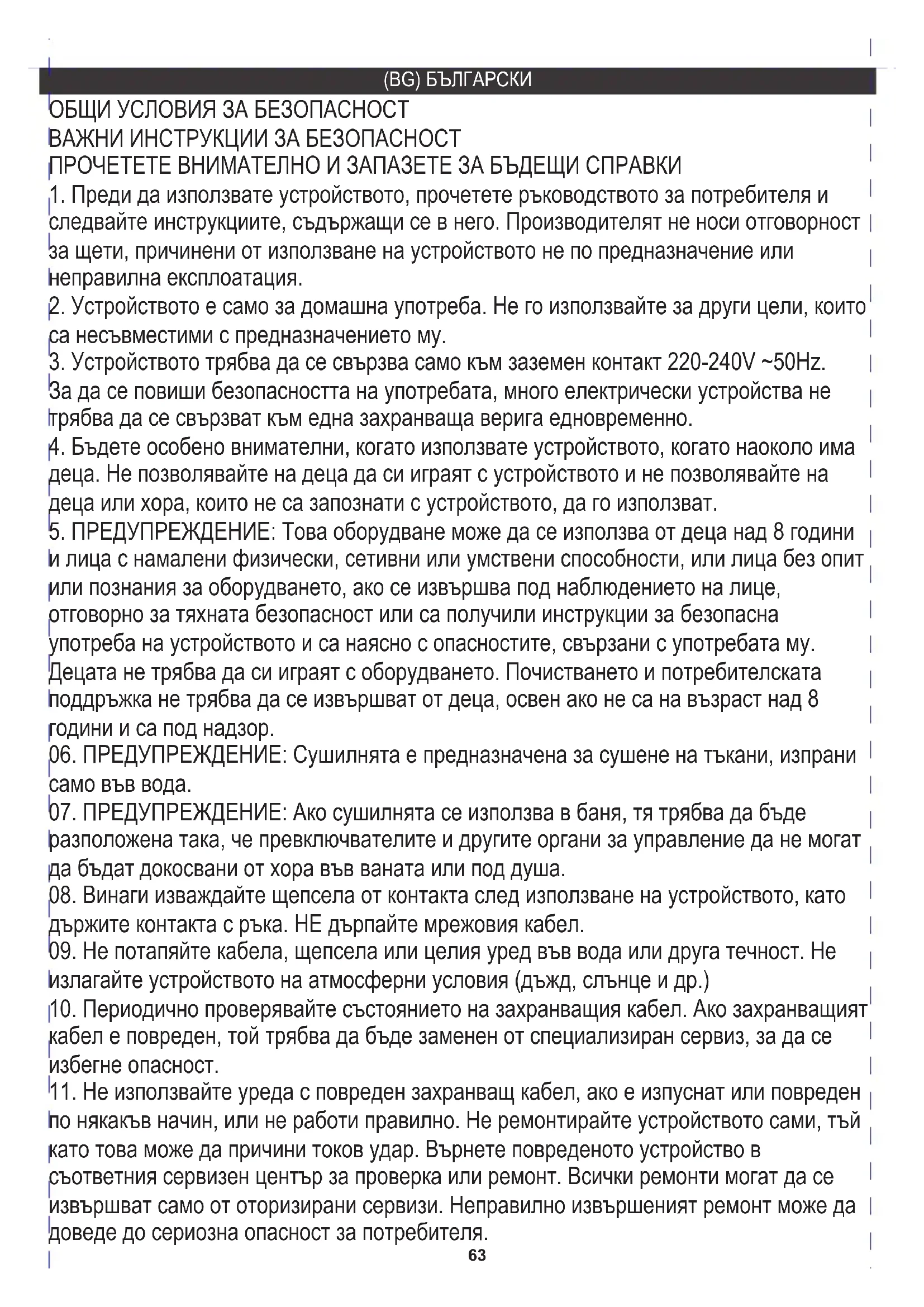 следвайте инструкциите, съдържащи се в него. Производителят не носи отговорност за щети, причинени от използване на устройството не по предназначение или неправилна експлоатация. ПРОЧЕТЕТЕ ВНИМАТЕЛНО И ЗАПАЗЕТЕ ЗА БЪДЕЩИ СПРАВКИ ВАЖНИ ИНСТРУКЦИИ ЗА БЕЗОПАСНОСТ ОБЩИ УСЛОВИЯ ЗА БЕЗОПАСНОСТ64