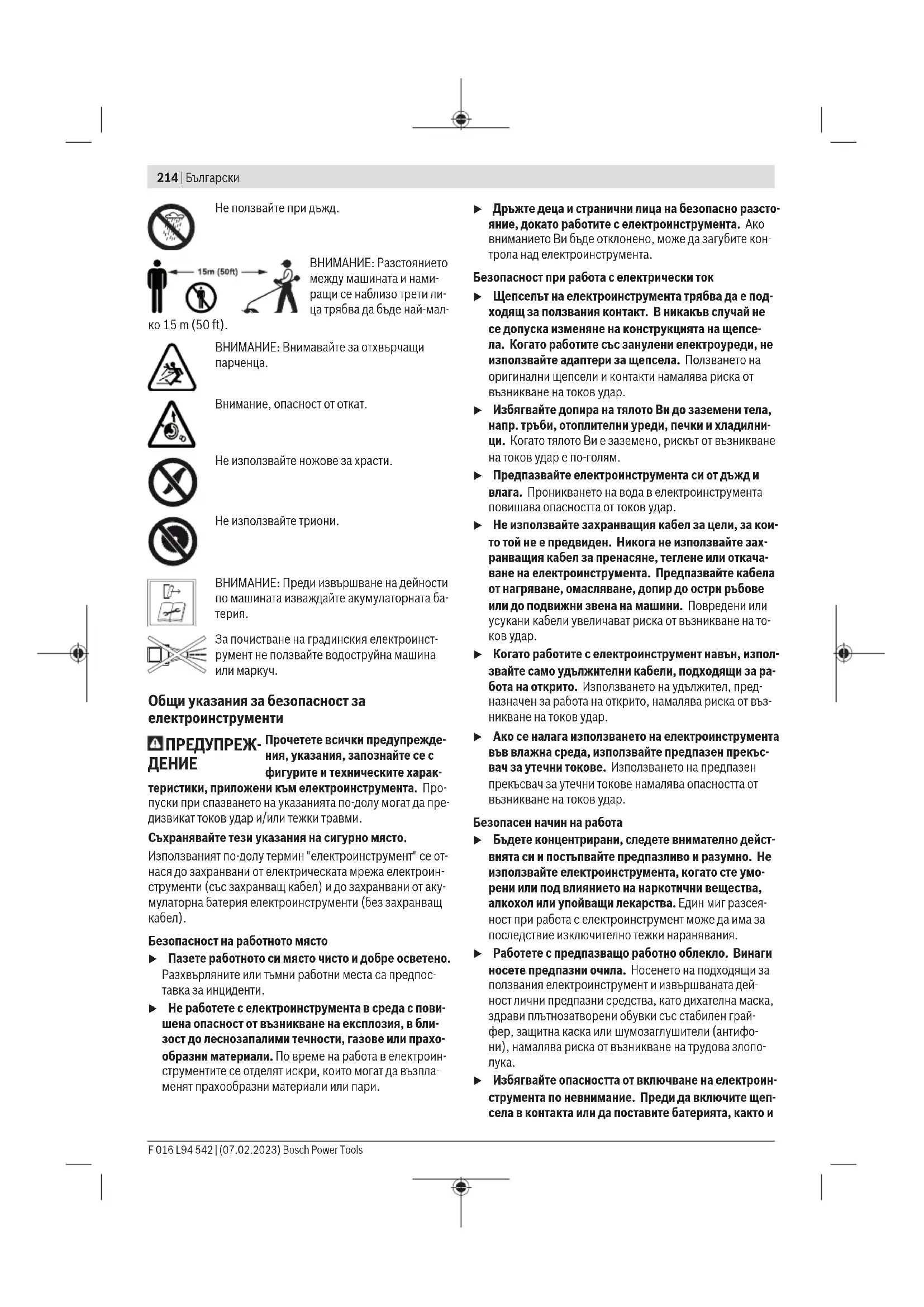 Указания за безопасна работа Пояснения на символите на машината Общо указание за опасност. Прочетете ръководството за експлоатация. Работете с лични предпазни средства за очите, ушите и главата. Работете с обувки със стабилен грайфер. Работете с предпазни ръкавици. ВНИМАНИЕ: Дръжте околни лица на безо- пасно разстояние. Bosch Power Tools F 016 L94 542 | (07.02.2023)214 | Български Не ползвайте при дъжд. ВНИМАНИЕ: Разстоянието между машината и нами- ращи се наблизо трети ли- ца трябва да бъде най-мал- ко 15 m (50 ft). ВНИМАНИЕ: Внимавайте за отхвърчащи