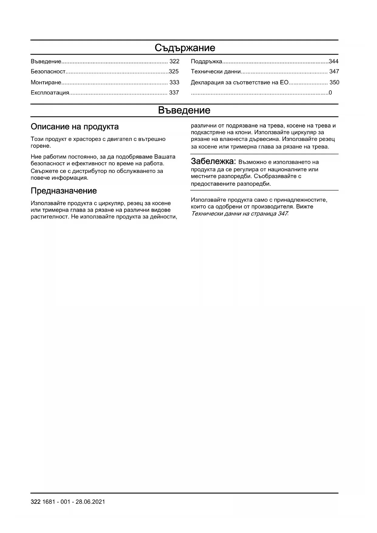Ние работим постоянно, за да подобряваме Вашата безопасност и ефективност по време на работа. Свържете се с дистрибутор по обслужването за повече информация. Предназначение Използвайте продукта с циркуляр, резец за косене или тримерна глава за рязане на различни видове растителност. Не използвайте продукта за дейности, различни от подрязване на трева, косене на трева и подкастряне на клони. Използвайте циркуляр за рязане на влакнеста дървесина. Използвайте резец за косене или тримерна глава за рязане на трева. Забележка: Възможно е използването на продукта да се регулира от националните или местните разпоредби. Съобразявайте с предоставените разпоредби. Използвайте продукта само с принадлежностите, които са одобрени от производителя. Вижте Технически данни на страница 347