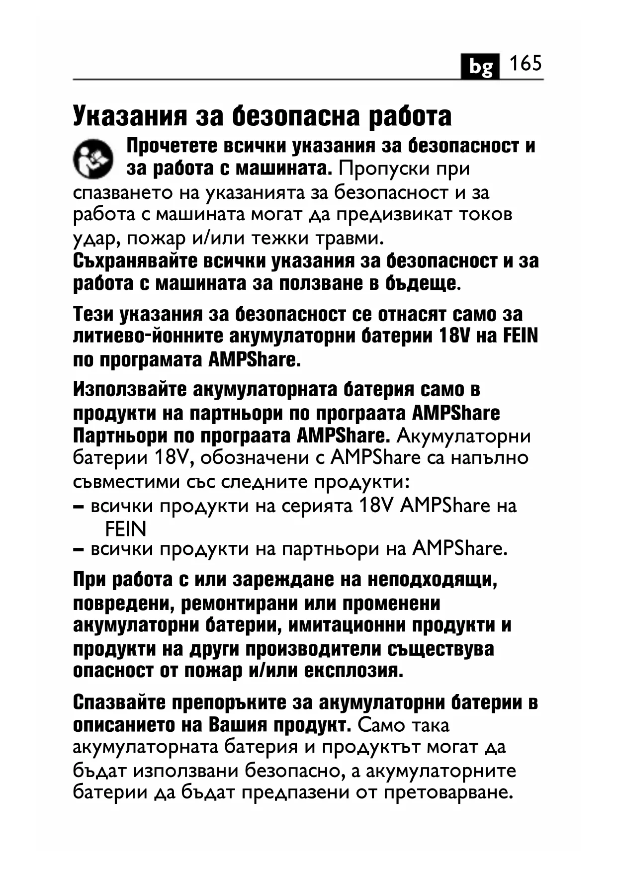 Указания за безопасна работа Прочетете всички указания за безопасност и за работа с машината. Пропуски при спазването на указанията за безопасност и за работа с машината могат да предизвикат токов удар, пожар и/или тежки травми. Съхранявайте всички указания за безопасност и за работа с машината за ползване в бъдеще. Тези указания за безопасност се отнасят само за литиево-йонните акумулаторни батерии 18V на FEIN по програмата AMPShare. Използвайте акумулаторната батерия само в продукти на партньори по програата AMPShare Партньори по програата AMPShare. Акумулаторни батерии 18V, обозначени с AMPShare са напълно съвместими със следните продукти: – всички продукти на серията 18V AMPShare на FEIN – всички продукти на партньори на AMPShare. При работа с или зареждане на неподходящи, повредени, ремонтирани или променени акумулаторни батерии, имитационни продукти и продукти на други производители съществува опасност от пожар и/или експлозия. Спазвайте препоръките за акумулаторни батерии в описанието на Вашия продукт. Само така акумулаторната батерия и продуктът могат да бъдат използвани безопасно, а акумулаторните батерии да бъдат предпазени от претоварване.166