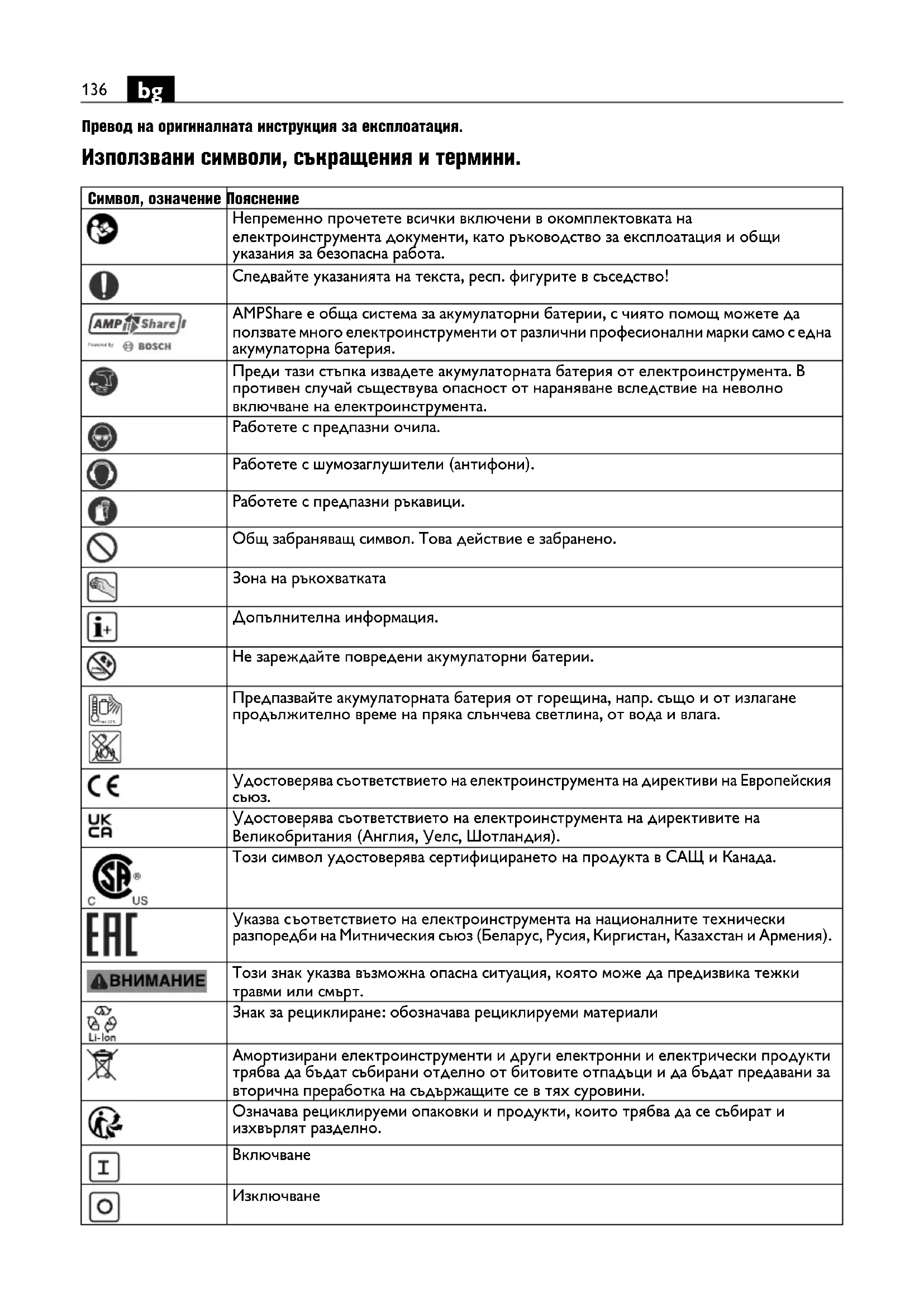 Превод на оригиналната инструкция за експлоатация. Използвани символи, съкращения и термини. Символ, означение Пояснение Непременно прочетете всички включени в окомплектовката на електроинструмента документи, като ръководство за експлоатация и общи указания за безопасна работа. Следвайте указанията на текста, респ. фигурите в съседство! AMPShare е обща система за акумулаторни батерии, с чиято помощ можете да ползвате много електроинструменти от различни професионални марки само с една акумулаторна батерия. Преди тази стъпка извадете акумулаторната батерия от електроинструмента. В противен случай съществува опасност от нараняване вследствие на неволно включване на електроинструмента. Работете с предпазни очила. Работете с шумозаглушители (антифони). Работете с предпазни ръкавици. Общ забраняващ символ. Това действие е забранено. Зона на ръкохватката Допълнителна информация. Не зареждайте повредени акумулаторни батерии. Предпазвайте акумулаторната батерия от горещина, напр. също и от излагане продължително време на пряка слънчева светлина, от вода и влага. Удостоверява съответствието на електроинструмента на директиви на Европейския