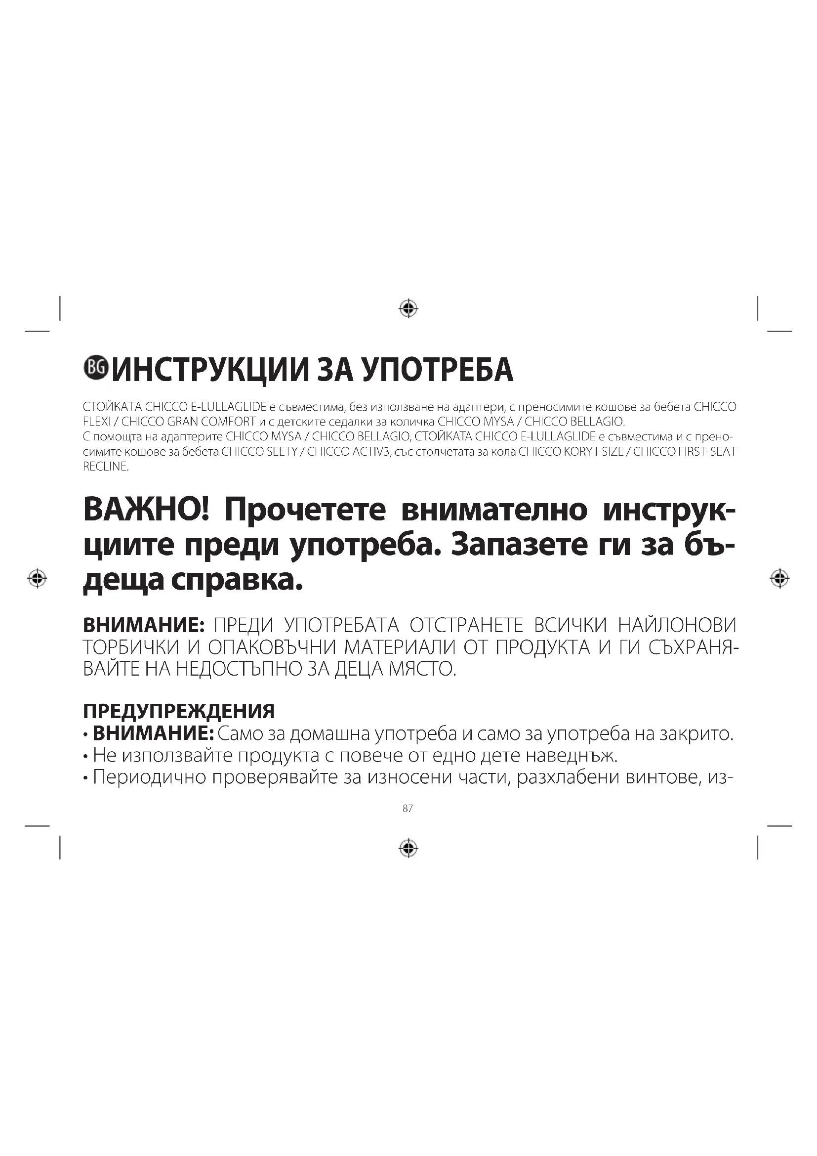 - ВНИМАНИЕ: Да не се допуска други деца да играят близо до кошчето без надзор. Употреба на СТОЙКАТА CHICCO E-LULLAGLIDE със седалка за количка или столче за кола: