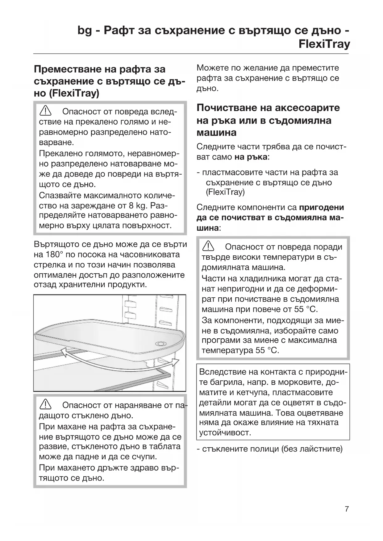 Опасност от повреда поради твърде високи температури в съ- домиялната машина. Части на хладилника могат да ста- нат непригодни и да се деформи- рат при почистване в съдомиялна машина при повече от 55°C. За компоненти, подходящи за мие- не в съдомиялна, изборайте само програми за миене с максимална температура 55°C. Вследствие на контакта с природни- те багрила, напр. в морковите, до- матите и кетчупа, пластмасовите детайли могат да се оцветят в съдо- миялната машина. Това оцветяване няма да окаже влияние на тяхната устойчивост. - стъклените полици (без лайстните)bg - Рафт за съхранение с въртящо се дъно - FlexiTray