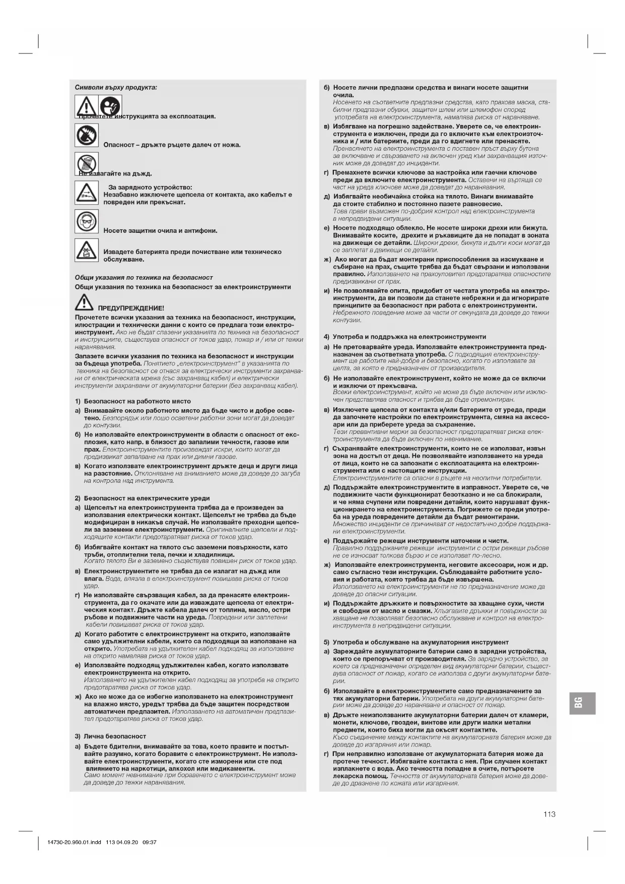 Използвайте електроинструмента, неговите аксесоари, нож и др. само съгласно тези инструкции. Съблюдавайте работните усло- вия и работата, която трябва да бъде извършена. Използването на електроинструменти не по предназначение може да доведе до опасни ситуации. и) Поддържайте дръжките и повърхностите за хващане сухи, чисти исвободни от масло и смазки. Хлъзгавите дръжки и повърхности за хващане не позволяват безопасно обслужване и контрол на електро- инструмента в непредвидени ситуации.