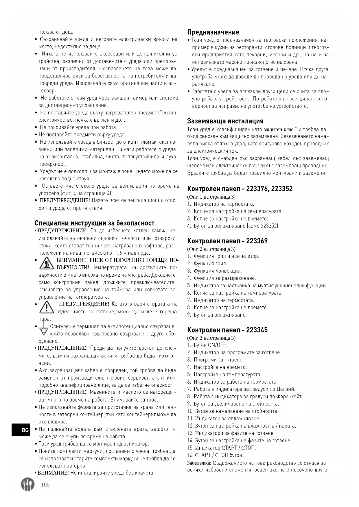 лява риска от токов удар, като осигурява изходен проводник за електрическия ток. Този уред е снабден със захранващ кабел със заземяващ щепсел или електрически връзки със заземяващ проводник. Връзките трябва да бъдат правилно монтирани и заземени. Контролен панел - 223376, 223352 (Фиг. 1 на страница 3)