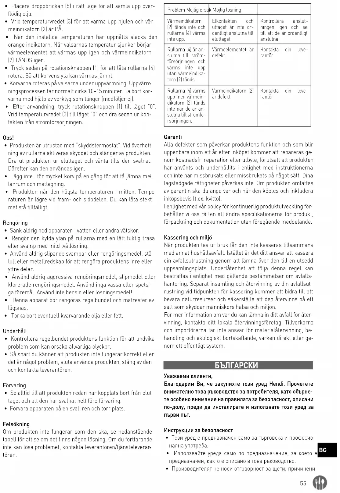 - Уредът е снабден с “защитен термостат”. В случай на прегряване на ролките, защитата ще бъде активирана и ще изключи уреда. Изключете уреда от електрическия контакт и изчакайте охлаждането му да се охлади. След това може да се използва отново.