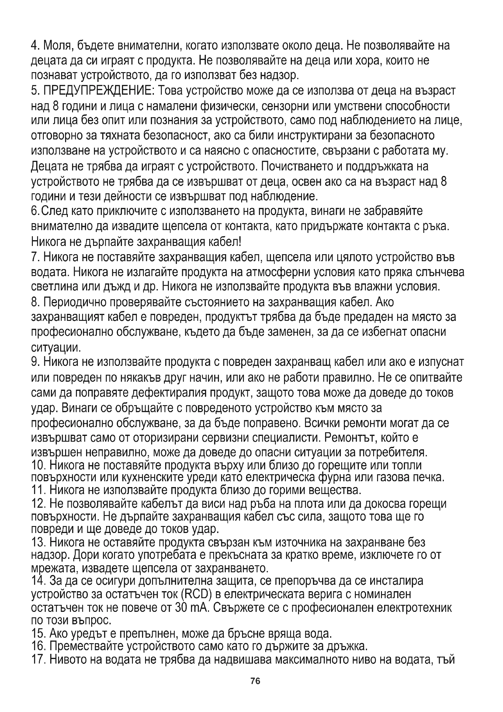 над 8 години и лица с намалени физически, сензорни или умствени способности или лица без опит или познания за устройството, само под наблюдението на лице, отговорно за тяхната безопасност, ако са били инструктирани за безопасното използване на устройството и са наясно с опасностите, свързани с работата му. Децата не трябва да играят с устройството. Почистването и поддръжката на устройството не трябва да се извършват от деца, освен ако са на възраст над 8 години и тези дейности се извършват под наблюдение.