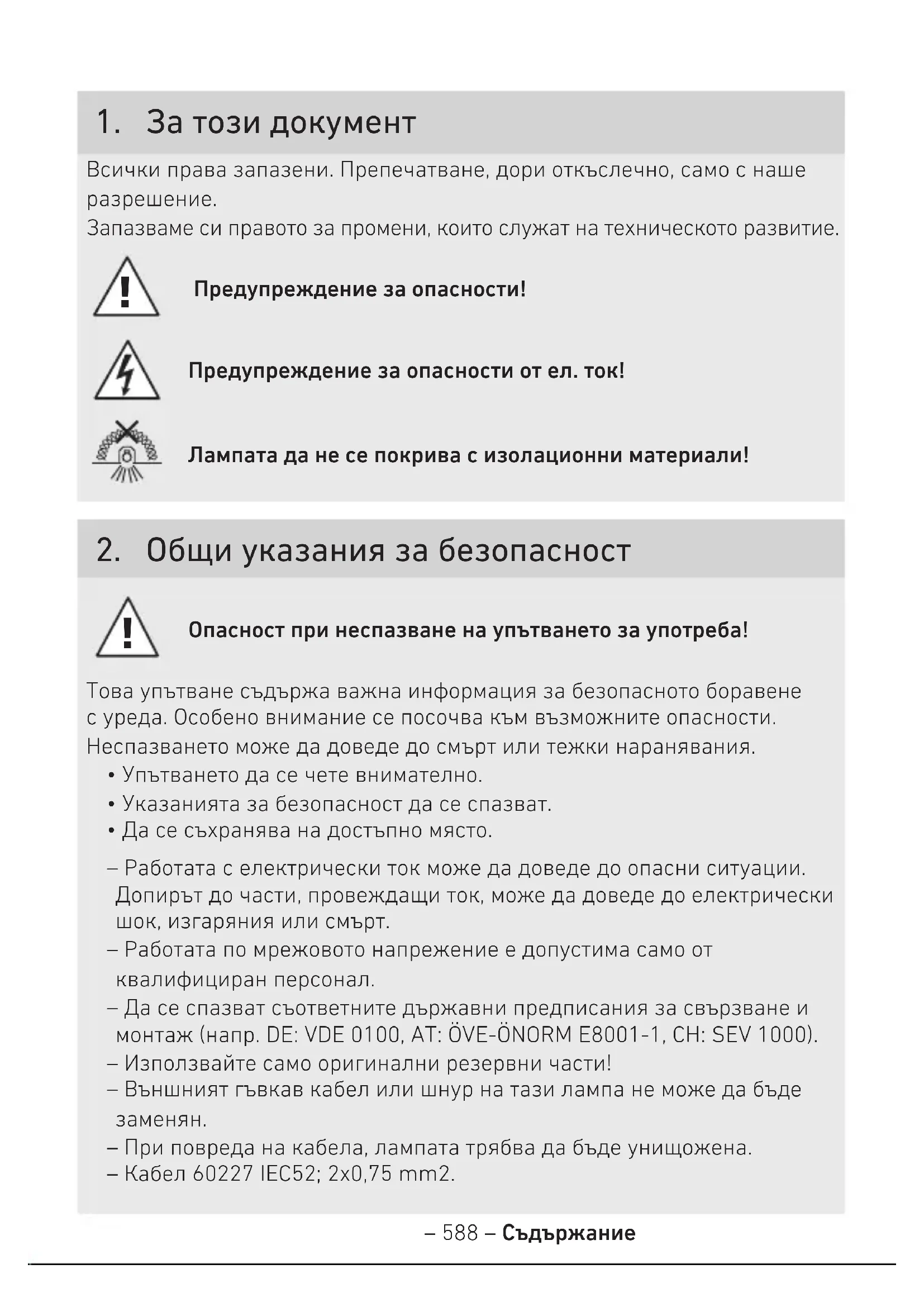 – При повреда на кабела, лампата трябва да бъде унищожена. – Кабел 60227 IEC52; 2x0,75 mm2.– 589 – Съдържание