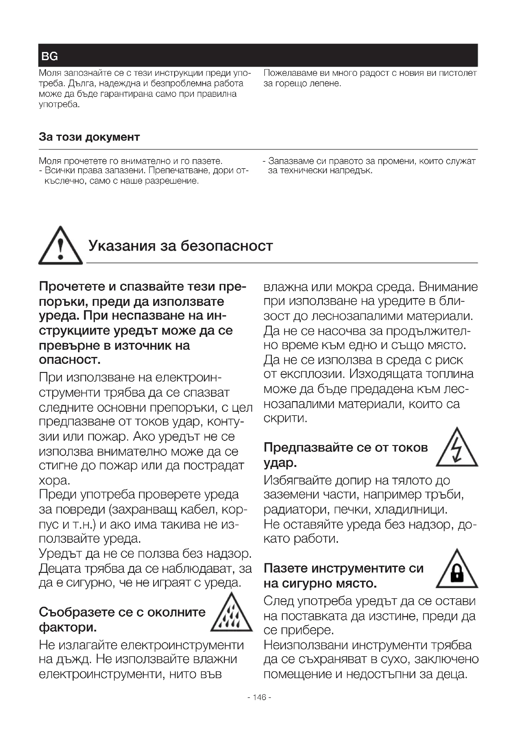 Пожелаваме ви много радост с новия ви пистолет за горещо лепене. BGОригинал - Упътване за употреба За този документ Моля прочетете го внимателно и го пазете. - Всички права запазени. Препечатване, дори от- къслечно, само с наше разрешение. - Запазваме си правото за промени, които служат за технически напредък. Прочетете и спазвайте тези пре- поръки, преди да използвате уреда. При неспазване на ин- струкциите уредът може да се превърне в източник на