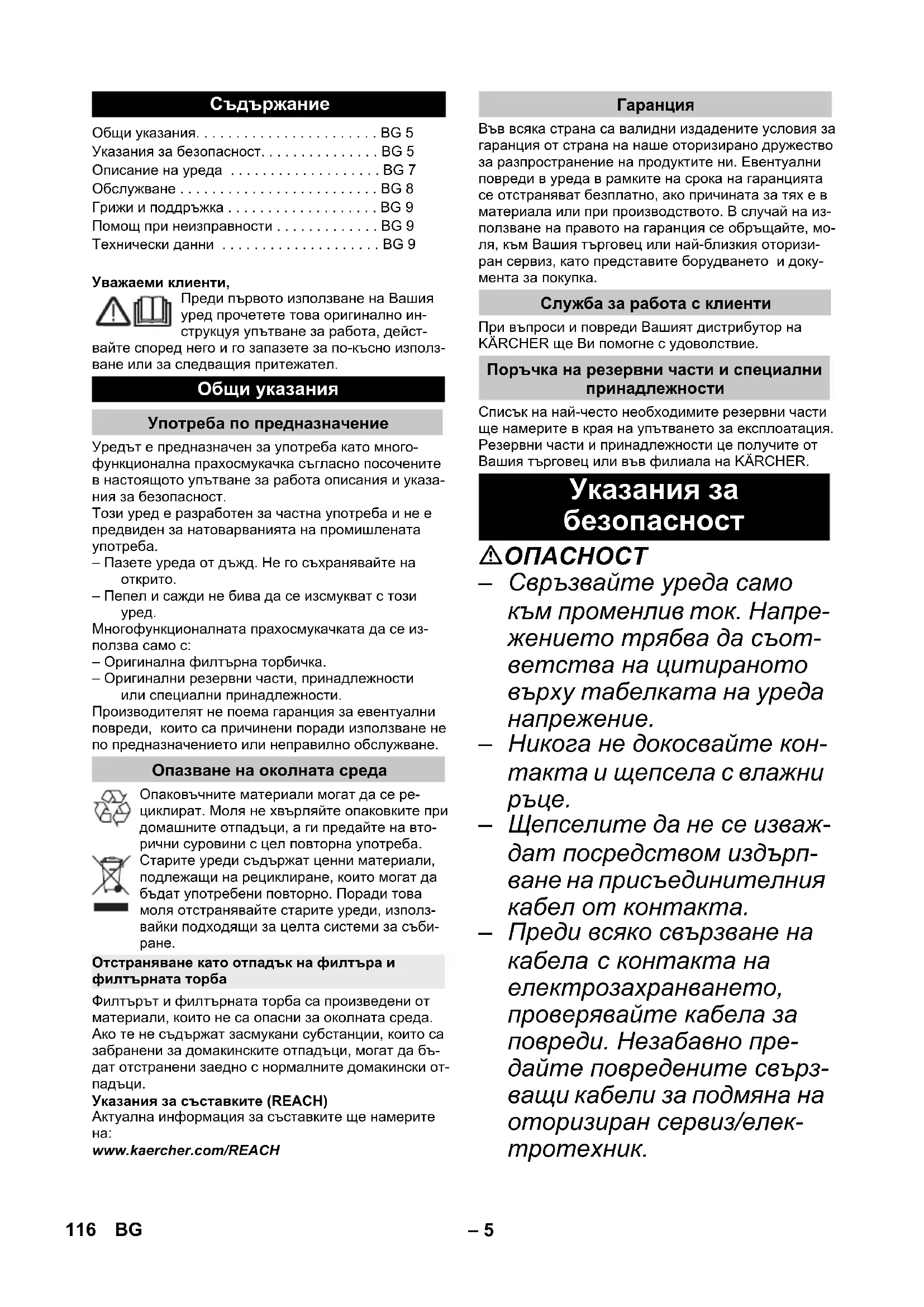 www.kaercher.com/REACH Във всяка страна са валидни издадените условия за гаранция от страна на наше оторизирано дружество за разпространение на продуктите ни. Евентуални повреди в уреда в рамките на срока на гаранцията се отстраняват безплатно, ако причината за тях е в материала или при производството. В случай на из- ползване на правото на гаранция се обръщайте, мо- ля, към Вашия търговец или най-близкия оторизи- ран сервиз, като представите борудването и доку- мента за покупка. При въпроси и повреди Вашият дистрибутор на KÄRCHER ще Ви помогне с удоволствие. Списък на най-често необходимите резервни части ще намерите в края на упътването за експлоатация. Резервни части и принадлежности це получите от Вашия търговец или във филиала на KÄRCHER.