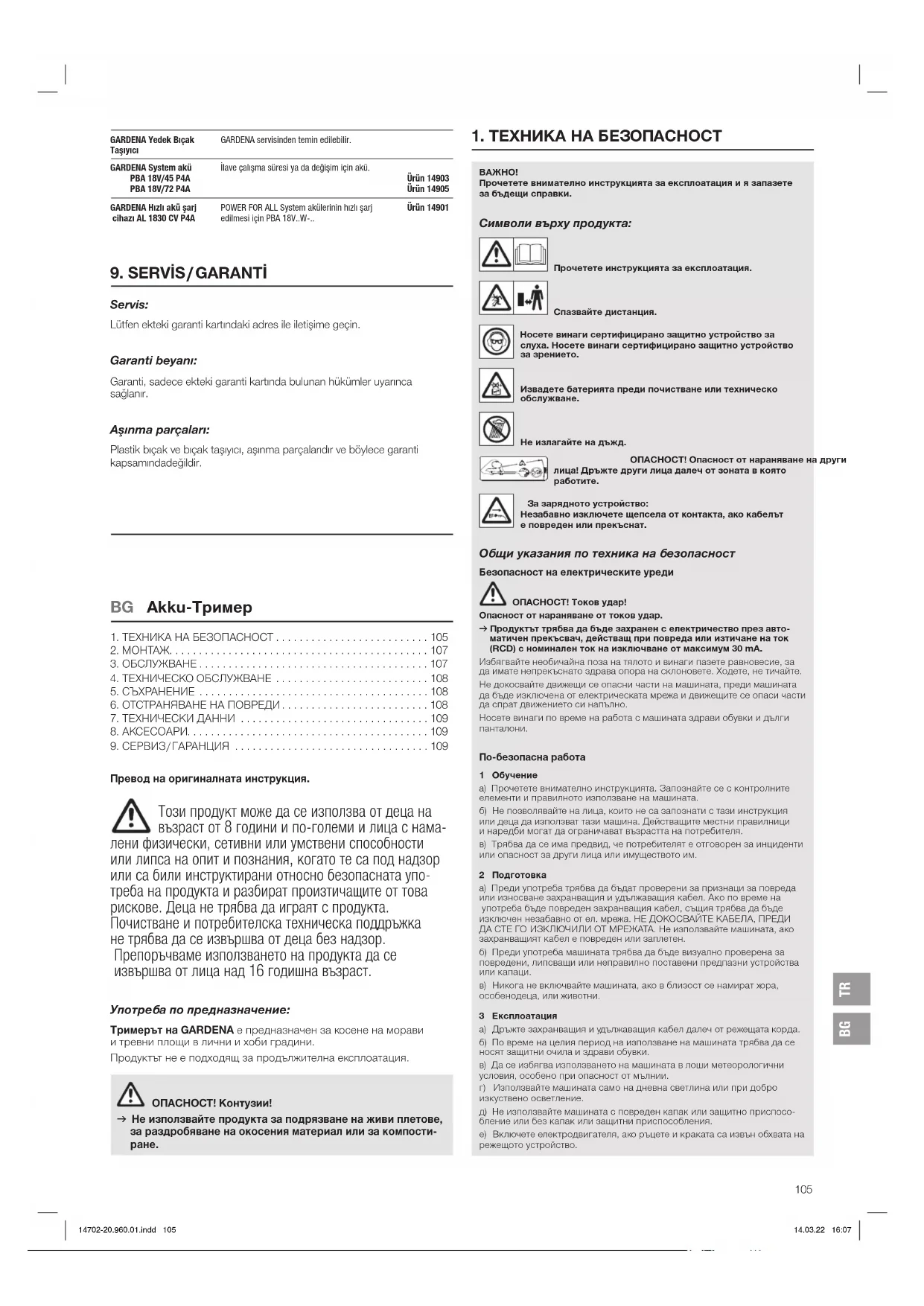 ВАЖНО! Прочетете внимателно инструкцията за експлоатация и я запазете за бъдещи справки. Символи върху продукта: Прочетете инструкцията за експлоатация. Спазвайте дистанция. Носете винаги сертифицирано защитно устройство за слуха. Носете винаги сертифицирано защитно устройство за зрението. Извадете батерията преди почистване или техническо обслужване. Не излагайте на дъжд. ОПАСНОСТ! Опасност от нараняване на други лица! Дръжте други лица далеч от зоната в която работите. За зарядното устройство: Незабавно изключете щепсела от контакта, ако кабелът еповреден или прекъснат. Общи указания по техника на безопасност Безопасност на електрическите уреди ОПАСНОСТ! Токов удар!Опасност от нараняване от токов удар. v Продуктът трябва да бъде захранен с електричество през авто- матичен прекъсвач, действащ при повреда или изтичане на ток (RCD) с номинален ток на изключване от максимум 30 mA.Избягвайте необичайна поза на тялото и винаги пазете равновесие, за да имате непрекъснато здрава опора на склоновете. Ходете, не тичайте. Не докосвайте движещи се опасни части на машината, преди машината да бъде изключена от електрическата мрежа и движещите се опаси части да спрат движението си напълно.Носете винаги по време на работа с машината здрави обувки и дълги панталони. По-безопасна работа 1 Обучениеa) Прочетете внимателно инструкцията. Запознайте се с контролните елементи и правилното използване на машината. б) Не позволявайте на лица, които не са запознати с тази инструкция или деца да използват тази машина. Действащите местни правилници и наредби могат да ограничават възрастта на потребителя.в) Трябва да се има предвид, че потребителят е отговорен за инциденти или опасност за други лица или имуществото им.2 Подготовкаa) Преди употреба трябва да бъдат проверени за признаци за повреда или износване захранващия и удължаващия кабел. Ако по време на употреба бъде повреден захранващия кабел, същия трябва да бъде изключен незабавно от ел. мрежа. НЕ ДОКОСВАЙТЕ КАБЕЛА, ПРЕДИ ДА СТЕ ГО ИЗКЛЮЧИЛИ ОТ МРЕЖАТА. Не използвайте машината, ако захранващият кабел е повреден или заплетен.б) Преди употреба машината трябва да бъде визуално проверена за повредени, липсващи или неправилно поставени предпазни устройства или капаци. в) Никога не включвайте машината, ако в близост се намират хора, особено деца, или животни.3 Експлоатация a) Дръжте захранващия и удължаващия кабел далеч от режещата корда. б) По време на целия период на използване на машината трябва да се носят защитни очила и здрави обувки.в) Да се избягва използването на машината в лоши метеорологични условия, особено при опасност от мълнии.г) Използвайте машината само на дневна светлина или при добро изкуствено осветление.д) Не използвайте машината с повреден капак или защитно приспосо-бление или без капак или защитни приспособления. е) Включете електродвигателя, ако ръцете и краката са извън обхвата на режещото устройство.