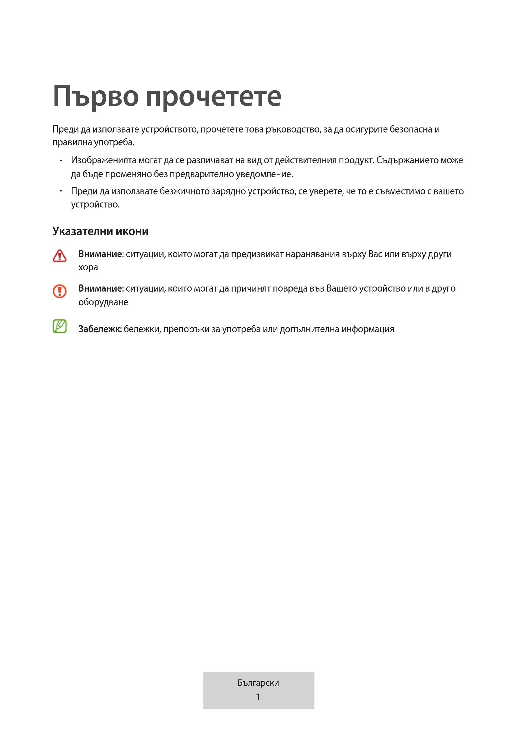 Преди да използвате безжичното зарядно устройство, се уверете, че то е съвместимо с вашето устройство. Указателни икони Внимание: ситуации, които могат да предизвикат наранявания върху Вас или върху други