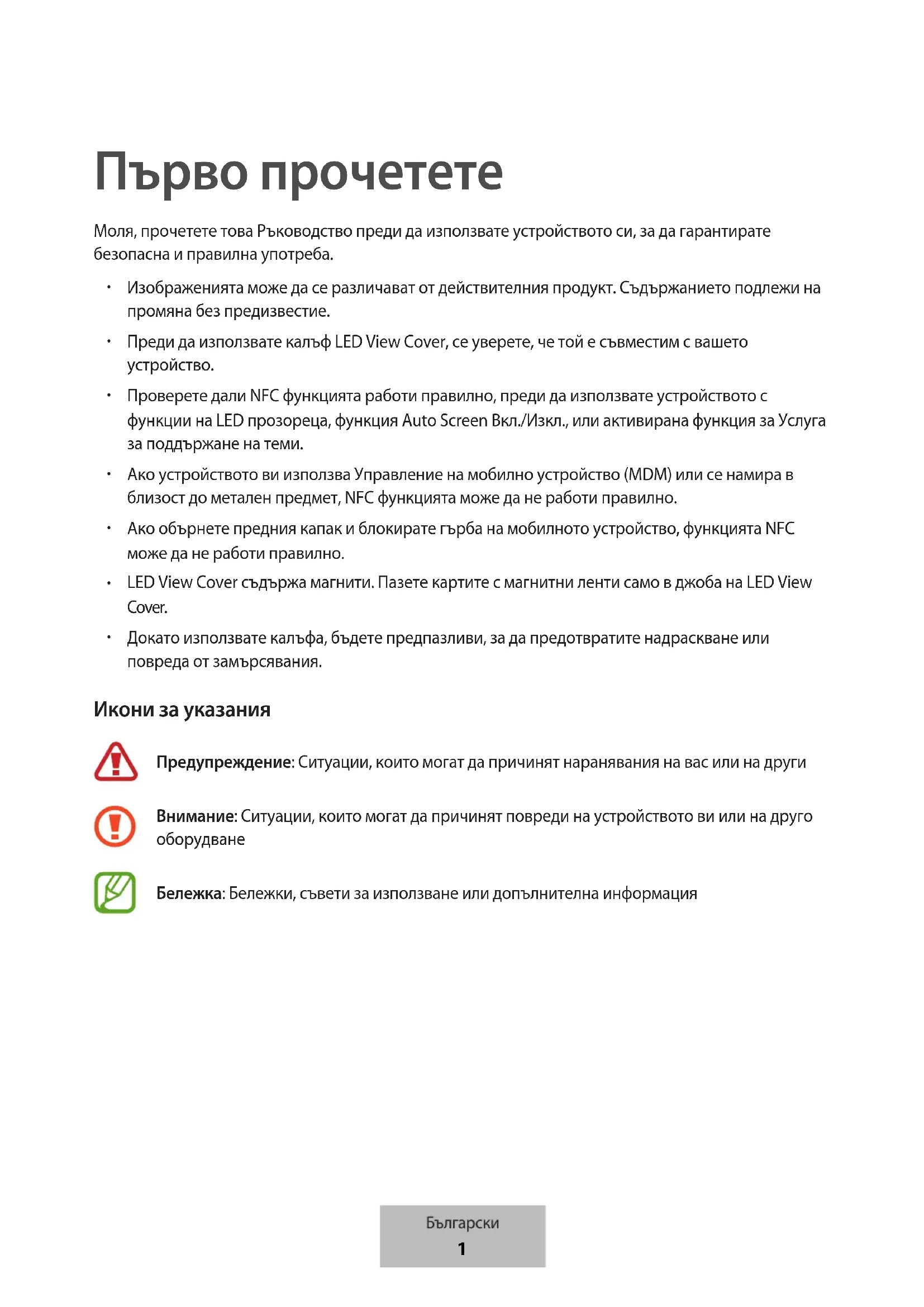 Докато използвате калъфа, бъдете предпазливи, за да предотвратите надраскване или повреда от замърсявания. Икони за указания Предупреждение: Ситуации, които могат да причинят наранявания на вас или на други Внимание: Ситуации, които могат да причинят повреди на устройството ви или на друго