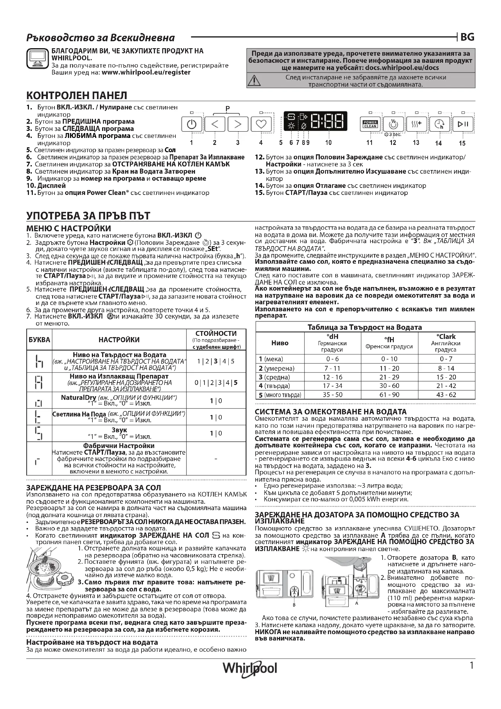 Преди да използвате уреда, прочетете внимателно указанията за безопасност и инсталиране. Повече информация за вашия продукт ще намерите на уебсайт: docs.whirlpool.eu/docs След инсталиране не забравяйте да махнете всички транспортни части от съдомиялната. МЕНЮ С НАСТРОЙКИ
