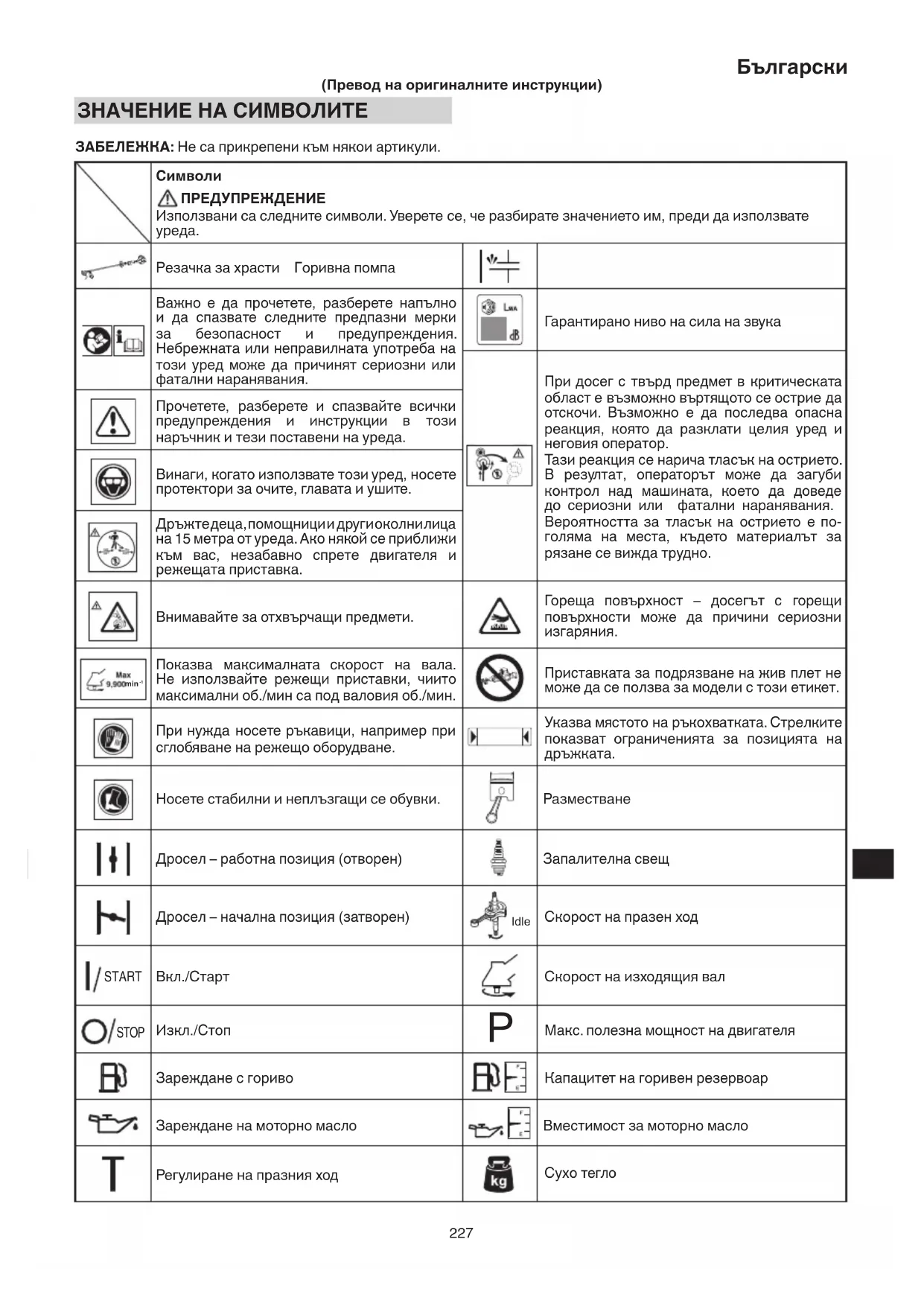 Резачка за храсти Горивна помпа Важно е да прочетете, разберете напълно и да спазвате следните предпазни мерки за безопасност и предупреждения. Небрежната или неправилната употреба на този уред може да причинят сериозни или фатални наранявания. Гарантирано ниво на сила на звука При досег с твърд предмет в критическата област е възможно въртящото се острие да отскочи. Възможно е да последва опасна реакция, която да разклати целия уред и неговия оператор. Тази реакция се нарича тласък на острието. В резултат, операторът може да загуби контрол над машината, което да доведе до сериозни или фатални наранявания. Вероятността за тласък на острието е по- голяма на места, където материалът за рязане се вижда трудно. Прочетете, разберете и спазвайте всички предупреждения и инструкции в този наръчник и тези поставени на уреда. Винаги, когато използвате този уред, носете протектори за очите, главата и ушите. Дръжте деца, помощници и други околни лица на 15 метра от уреда. Ако някой се приближи към вас, незабавно спрете двигателя и режещата приставка. Внимавайте за отхвърчащи предмети. Гореща повърхност – досегът с горещи повърхности може да причини сериозни