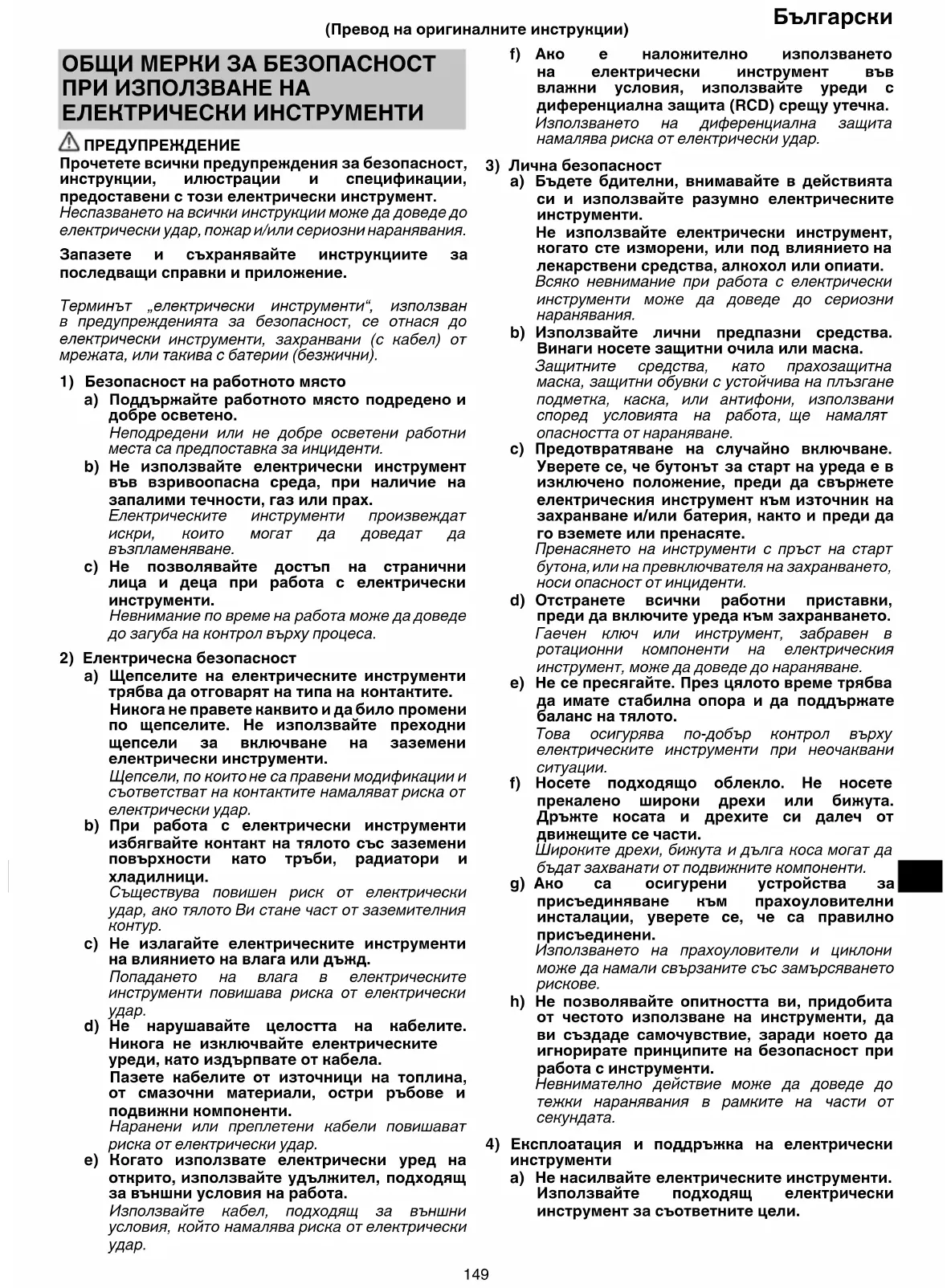 инструменти a) Не насилвайте електрическите инструменти. Използвайте подходящ електрически инструмент за съответните цели. ОБЩИ МЕРКИ ЗА БЕЗОПАСНОСТ ПРИ ИЗПОЛЗВАНЕ НА ЕЛЕКТРИЧЕСКИ ИНСТРУМЕНТИ ПРЕДУПРЕЖДЕНИЕ Прочетете всички предупреждения за безопасност, инструкции, илюстрации и спецификации, предоставени с този електрически инструмент. Неспазването на всички инструкции може да доведе до електрически удар, пожар и/или сериозни наранявания. Запазете и съхранявайте инструкциите за последващи справки и приложение. Терминът „електрически инструменти“, използван в предупрежденията за безопасност, се отнася до електрически инструменти, захранвани (с кабел) от мрежата, или такива с батерии (безжични).