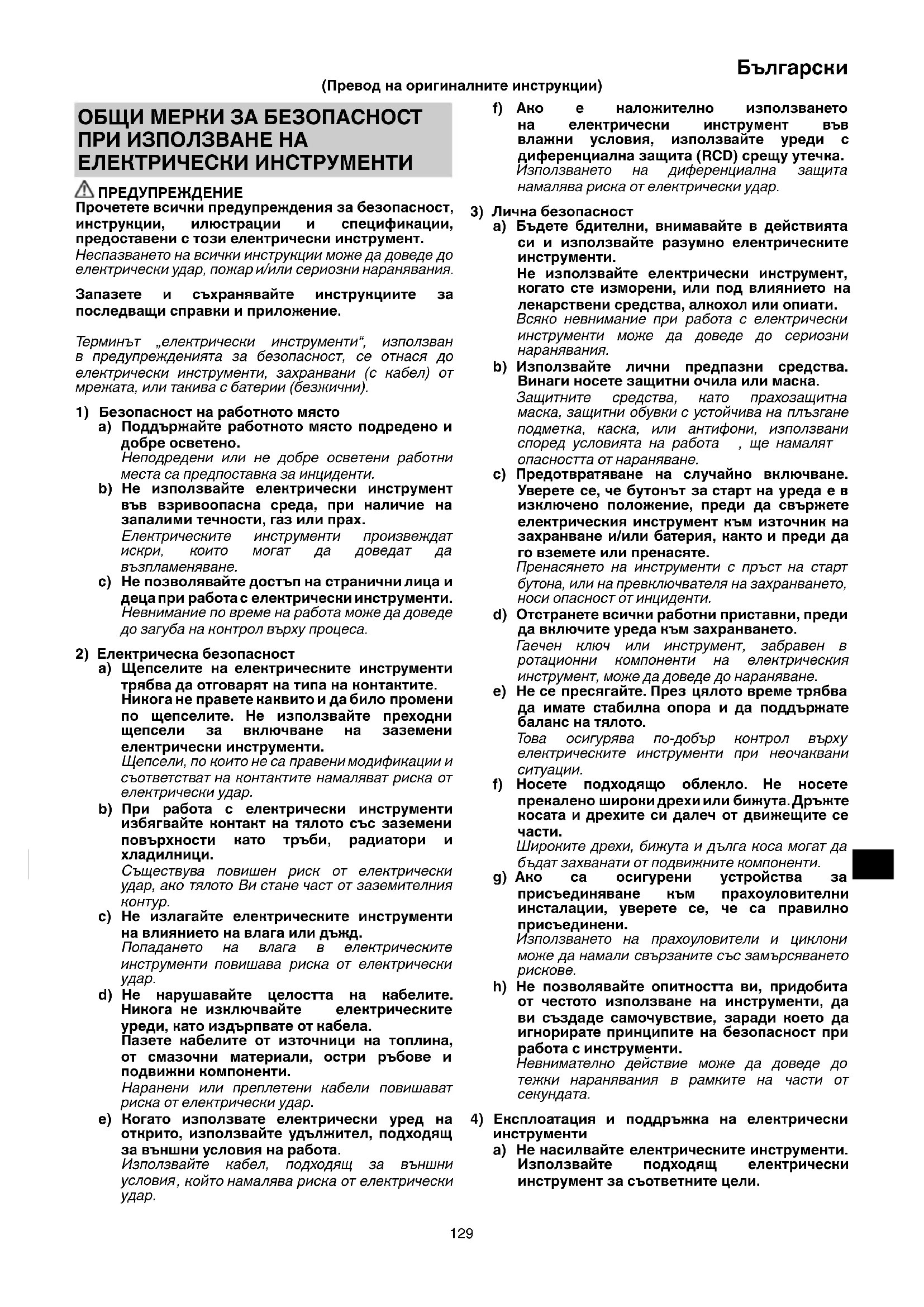 да се отразят на работата на електрическите инструменти. Ако установите повреди, отстранете ги преди да използвате електрическите инструменти. Много злополуки се дължат на лоша поддръжка на електрическите инструменти. f) Поддържайте режещите инструменти заточени и чисти. Правилно поддържаните режещи инструменти, с наточени режещи елементи, се управляват и контролират по-лесно.
