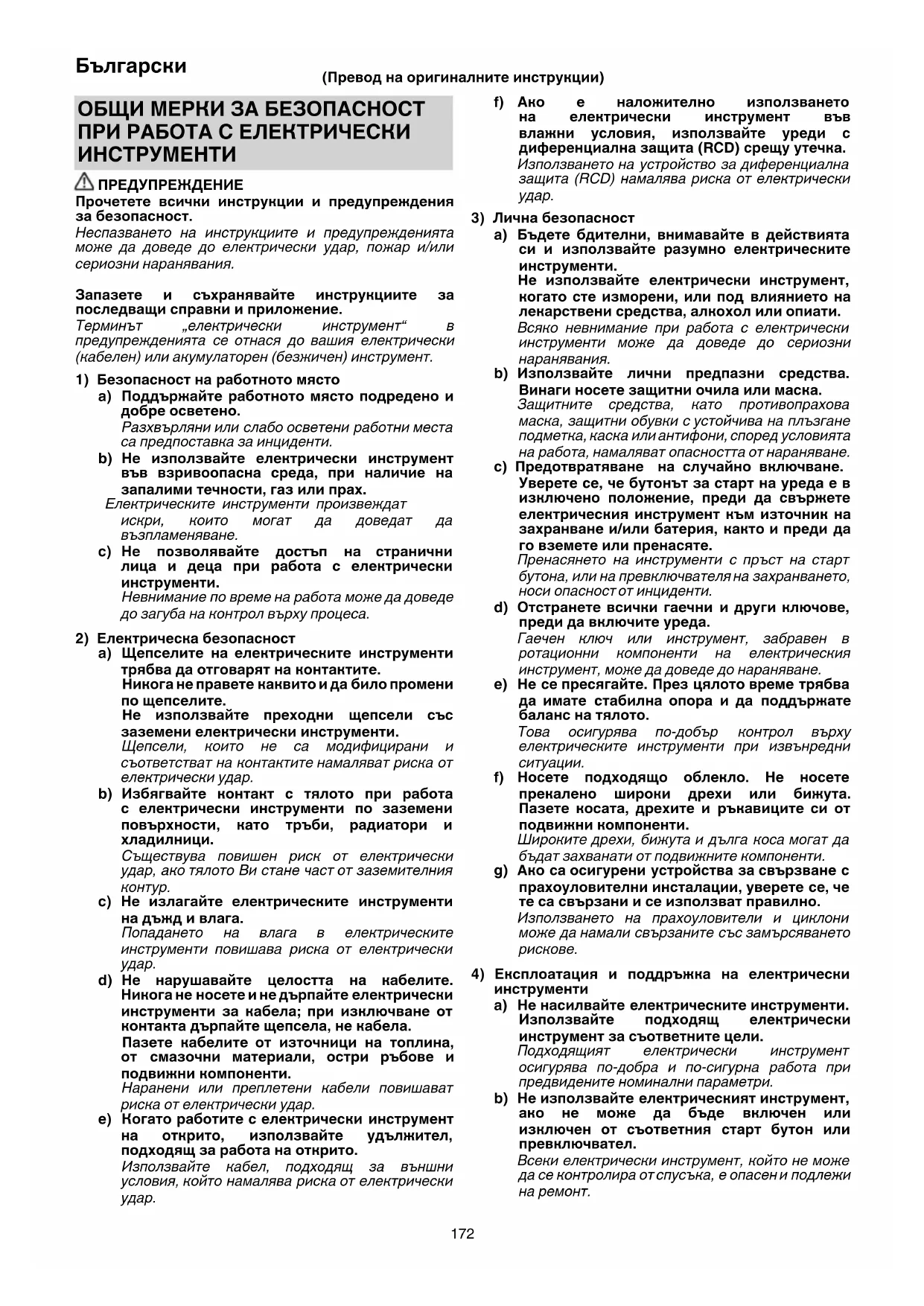 a) Щепселите на електрическите инструменти трябва да отговарят на контактите. Никога не правете каквито и да било промени по щепселите. Не използвайте преходни щепсели със заземени електрически инструменти. Щепсели, които не са модифицирани и съответстват на контактите намаляват риска от електрически удар. b) Избягвайте контакт с тялото при работа с електрически инструменти по заземени повърхности, като тръби, радиатори и хладилници. Съществува повишен риск от електрически удар, ако тялото Ви стане част от заземителния
