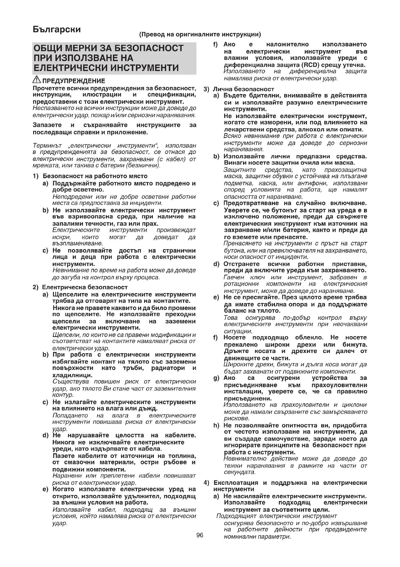 (Превод на оригиналните инструкции) f) Ако е наложително използването на електрически инструмент във влажни условия, използвайте уреди с диференциална защита (RCD) срещу утечка. Използването на диференциална защита намалява риска от електрически удар.