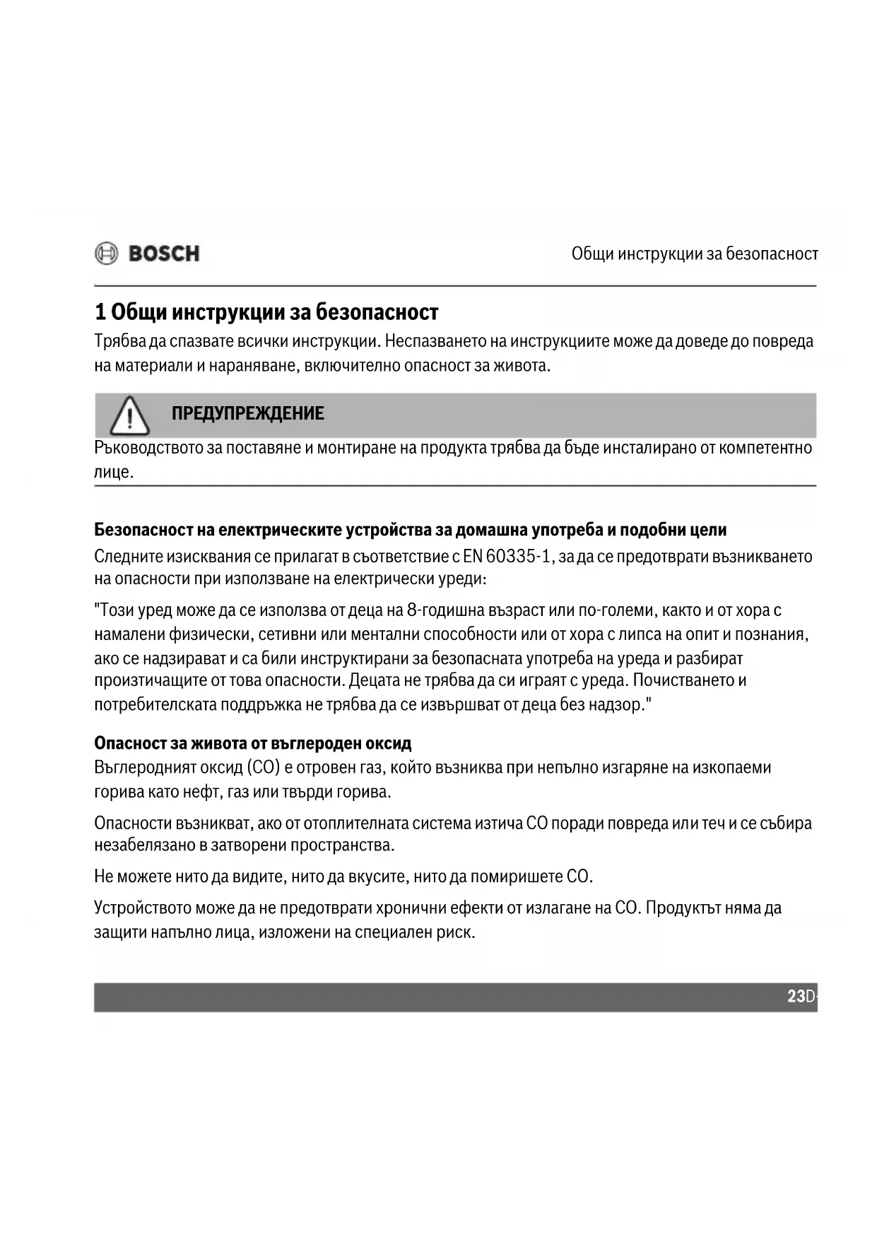Безопасност на електрическите устройства за домашна употреба и подобни цели Следните изисквания се прилагат в съответствие с EN 60335-1, за да се предотврати възникването на опасности при използване на електрически уреди: "Този уред може да се използва от деца на 8-годишна възраст или по-големи, както и от хора с намалени физически, сетивни или ментални способности или от хора с липса на опит и познания, ако се надзирават и са били инструктирани за безопасната употреба на уреда и разбират произтичащите от това опасности. Децата не трябва да си играят с уреда. Почистването и потребителската поддръжка не трябва да се извършват от деца без надзор." Опасност за живота от въглероден оксид Въглеродният оксид (CO) е отровен газ, който възниква при непълно изгаряне на изкопаеми горива като нефт, газ или твърди горива. Опасности възникват, ако от отоплителната система изтича CO поради повреда или теч и се събира незабелязано в затворени пространства. Не можете нито да видите, нито да вкусите, нито да помиришете CO. Устройството може да не предотврати хронични ефекти от излагане на CO. Продуктът няма да защити напълно лица, изложени на специален риск.Общи инструкции за безопасност D-CO – 6721848329 (2022/02)24 Отоплителната система трябва да се проверява и обслужва редовно от одобрен контрактор. ПРЕДУПРЕЖДЕНИЕ Инсталирането на алармата не трябва да се използва като заместител на правилното инсталиране, използване и поддръжка на уреди, горящи гориво, включително подходящи вентилационни и смукателни системи. Какво да направите при наличие на аларма за въглероден оксид ▶ Запазете спокойствие и отворете всички врати и прозорци, за да увеличите скоростта на