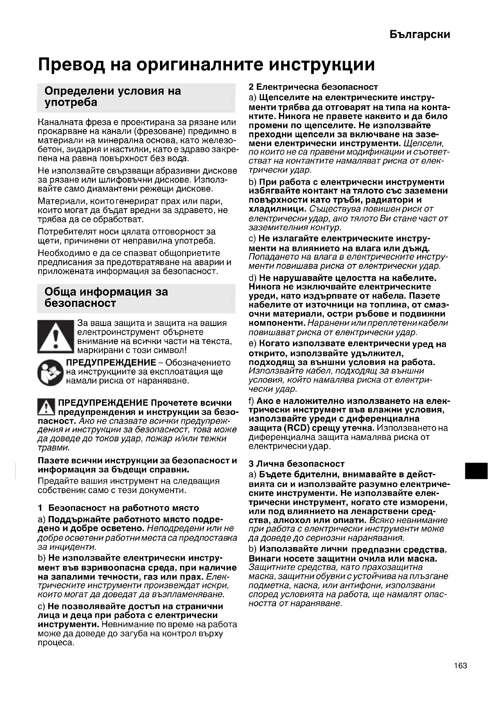 Превод на оригиналните инструкции Каналната фреза е проектирана за рязане или прокарване на канали (фрезоване) предимно в материали на минерална основа, като железо- бетон, зидария и настилки, като е здраво закре- пена на равна повърхност без вода. Не използвайте свързващи абразивни дискове за рязане или шлифовъчни дискове. Използ- вайте само диамантени режещи дискове. Материали, които генерират прах или пари, които могат да бъдат вредни за здравето, не трябва да се обработват. Потребителят носи цялата отговорност за щети, причинени от неправилна употреба. Необходимо е да се спазват общоприетите предписания за предотвратяване на аварии и приложената информация за безопасност. За ваша защита и защита на вашия електроинструмент