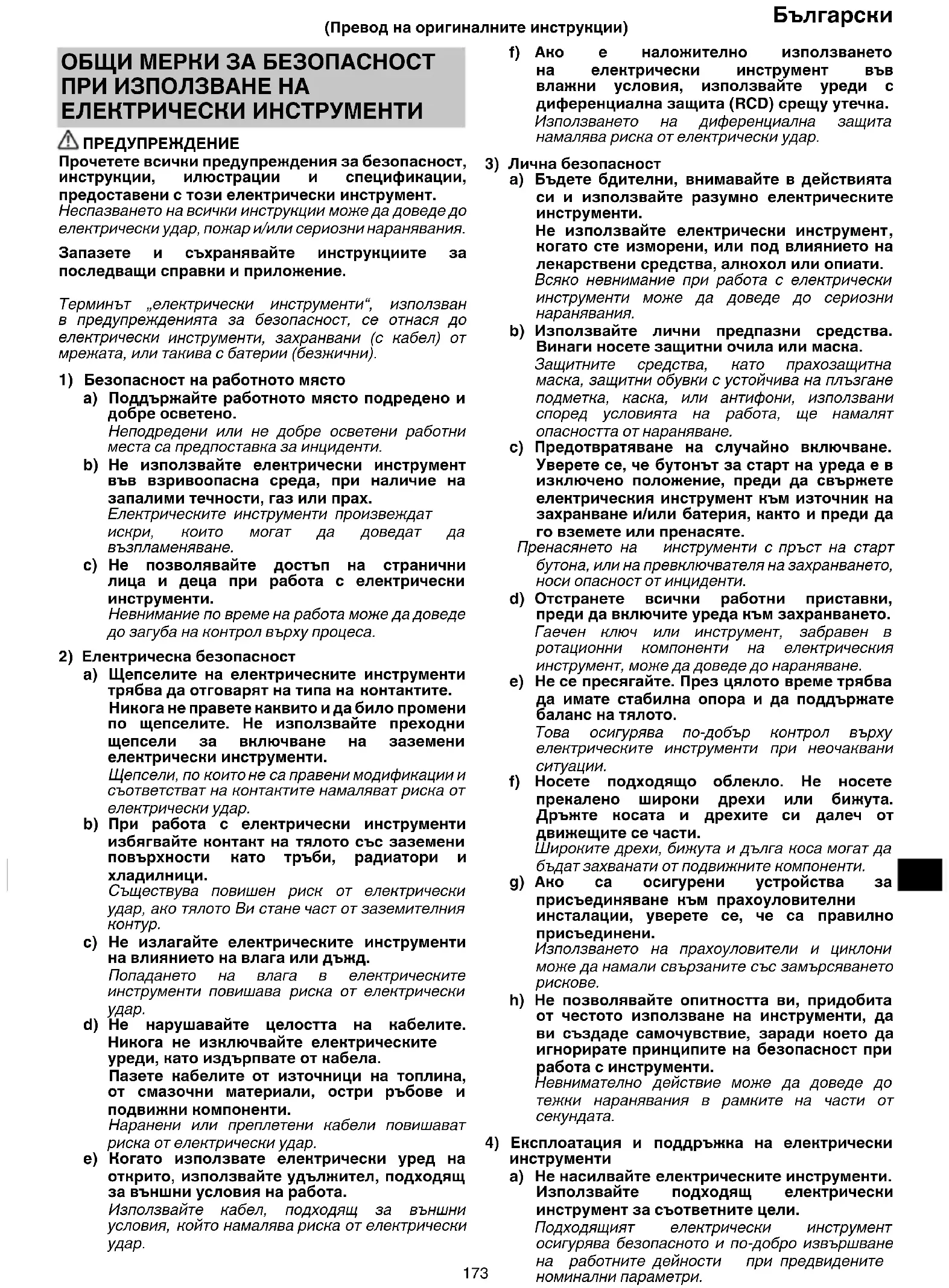 (Превод на оригиналните инструкции) ОБЩИ МЕРКИ ЗА БЕЗОПАСНОСТ ПРИ ИЗПОЛЗВАНЕ НА ЕЛЕКТРИЧЕСКИ ИНСТРУМЕНТИ ПРЕДУПРЕЖДЕНИЕ Прочетете всички предупреждения за безопасност, инструкции, илюстрации и спецификации, предоставени с този електрически инструмент. Неспазването на всички инструкции може да доведе до електрически удар, пожар и/или сериозни наранявания. Запазете и съхранявайте инструкциите за последващи справки и приложение. Терминът „електрически инструменти“, използван в предупрежденията за безопасност, се отнася до електрически инструменти, захранвани (с кабел) от мрежата, или такива с батерии (безжични).