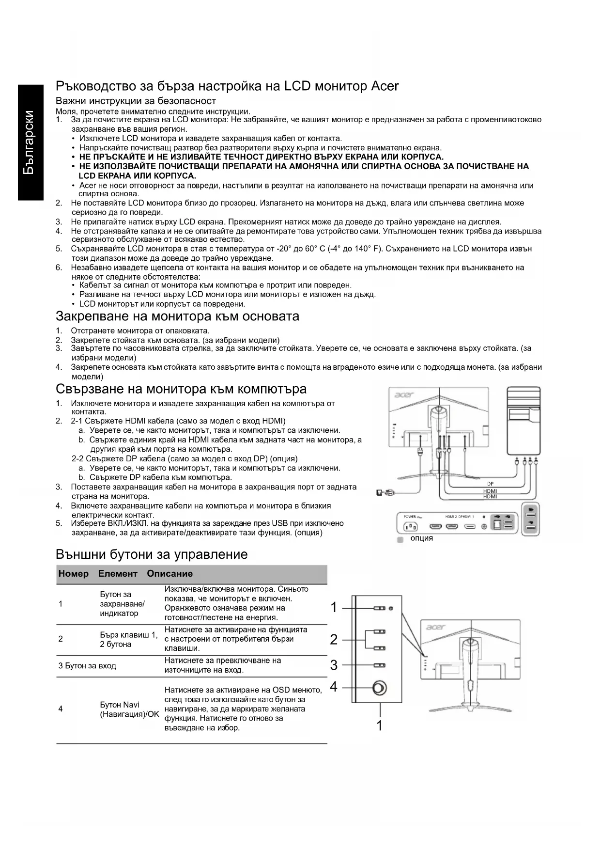 4Български Разпоредби и бележки за безопасност Бележка от Федералната комисия за комуникации (ФКК) Това устройство е тествано и отговаря на ограниченията за цифрово устройство от клас B, съгласно част 15 от правилата на ФКК. Тези ограничения са предназначени да осигуряват разумна защита срещу вредни смущения в жилищни инсталации. Това устройство генерира, използва и може да излъчва радиочестотна енергия и ако не бъде монтирано и използвано, в съответствие с инструкциите, може да причини вредни смущения на радио комуникациите. Въпреки това, няма гаранции, че няма да възникнат смущения в конкретна инсталация. Ако устройството причинява вредни смущения на радио и телевизионно приемане, което може да се установи чрез изключване и включване на устройството, потребителят се насърчава да се опита да коригира смущението чрез една от следните мерки: Преориентиране или преместване на антената на приемника. Увеличаване на разстоянието между устройството и приемника. Свързване на устройството вконтакт във верига, която е различна от тази, вкоято е свързан приемникът. Консултация сдоставчик или опитен радио/телевизионен техник за помощ. CE декларация за съответствие С настоящето, Acer Inc., декларира, че този LCD монитор е в съответствие със съществените изисквания и други приложими разпоредби на директивата за електромагнитна съвместимост (EMC) 2014/30/ЕC, директивата за ниско напрежение 2014/35/ЕC и RoHS директивата 2011/65/ЕC, и директива 2009/125/EО по отношение на създаването на рамка за определяне на изискванията за екодизайн за продукти, свързани с енергопотребление.