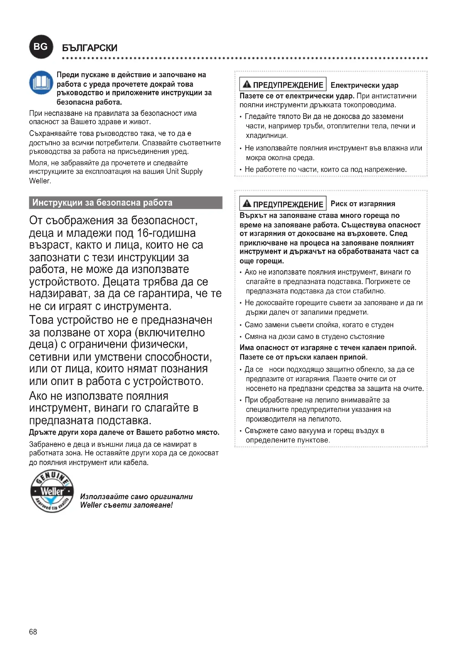 LIETUVIŠKAI68 Преди пускане в действие и започване на работа с уреда прочетете докрай това ръководство и приложените инструкции за безопасна работа. При неспазване на правилата за безопасност има опасност за Вашето здраве и живот. Съхранявайте това ръководство така, че то да е достъпно за всички потребители. Спазвайте съответните ръководства за работа на присъединения уред. Моля, не забравяйте да прочетете и следвайте инструкциите за експлоатация на вашия Unit Supply Weller. Инструкции за безопасна работа От съображения за безопасност, деца и младежи под 16-годишна възраст, както и лица, които не са запознати с тези инструкции за работа, не може да използвате устройството. Децата трябва да се надзирават, за да се гарантира, че те не си играят с инструмента. Това устройство не е предназначен за ползване от хора (включително деца) с ограничени физически, сетивни или умствени способности, или от лица, които нямат познания или опит в работа с устройството. Ако не използвате поялния инструмент, винаги го слагайте в предпазната подставка. Дръжте други хора далече от Вашето работно място. Забранено е деца и външни лица да се намират в работната зона. Не оставяйте други хора да се докосват до поялния инструмент или кабела. Използвайте само оригинални Weller съвети запояване! ПРЕДУПРЕЖДЕНИЕ Електрически удар Пазете се от електрически удар. При антистатични поялни инструменти дръжката токопроводима.