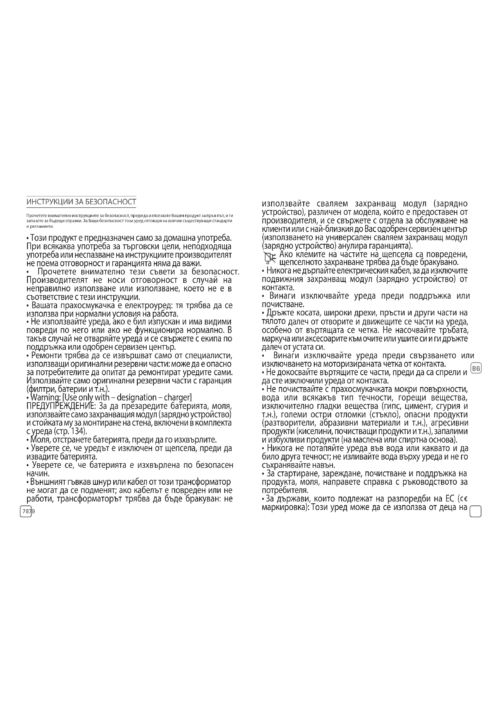 - Warning: [Use only with – designation – charger] ПРЕДУПРЕЖДЕНИЕ: За да презаредите батерията, моля, използвайте само захранващия модул (зарядно устройство) и стойката му за монтиране на стена, включени в комплекта с уреда (стр. 134).