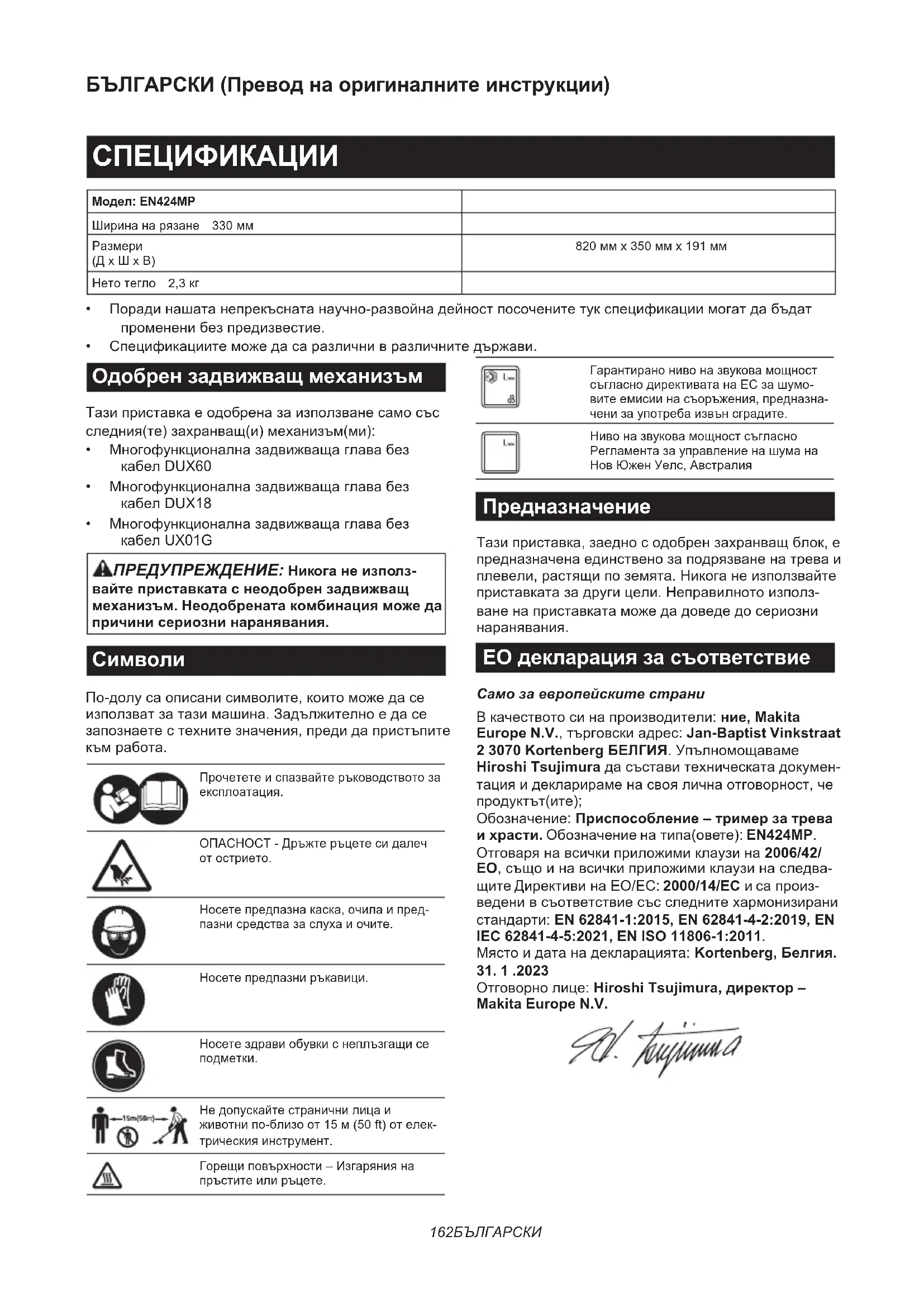 Недопускайтестраничнилицаи животнипо-близоот15м(50ft)отелек- трическияинструмент. Горещиповърхности–Изгарянияна пръститеилиръцете. Гарантиранонивоназвуковамощност съгласнодирективатанаЕСзашумо- витеемисиинасъоръжения,предназна- ченизаупотребаизвънсградите. Нивоназвуковамощностсъгласно Регламентазауправлениенашумана НовЮженУелс,Австралия Предназначение Тазиприставка,заедносодобрензахранващблок,е предназначенаединственозаподрязваненатреваи плевели,растящипоземята.Никоганеизползвайте приставкатазадругицели.Неправилнотоизполз- ваненаприставкатаможедадоведедосериозни наранявания. ЕО декларация за съответствие Само за европейските страни Вкачествотосинапроизводители:ние, Makita Europe N.V.,търговскиадрес:Jan-Baptist Vinkstraat 2 3070 Kortenberg БЕЛГИЯ.Упълномощаваме Hiroshi Tsujimuraдасъставитехническатадокумен- тацияидекларираменасвояличнаотговорност,че продуктът(ите); Обозначение:Приспособление – тример за трева и храсти.Обозначениенатипа(овете):EN424MP. Отговарянавсичкиприложимиклаузина2006/42/ ЕО,същоинавсичкиприложимиклаузинаследва- щитеДирективинаЕО/ЕС:2000/14/ECисапроиз- веденивсъответствиесъсследнитехармонизирани стандарти:EN 62841-1:2015, EN 62841-4-2:2019, EN IEC 62841-4-5:2021, EN ISO 11806-1:2011. Мястоидатанадекларацията:Kortenberg, Белгия.