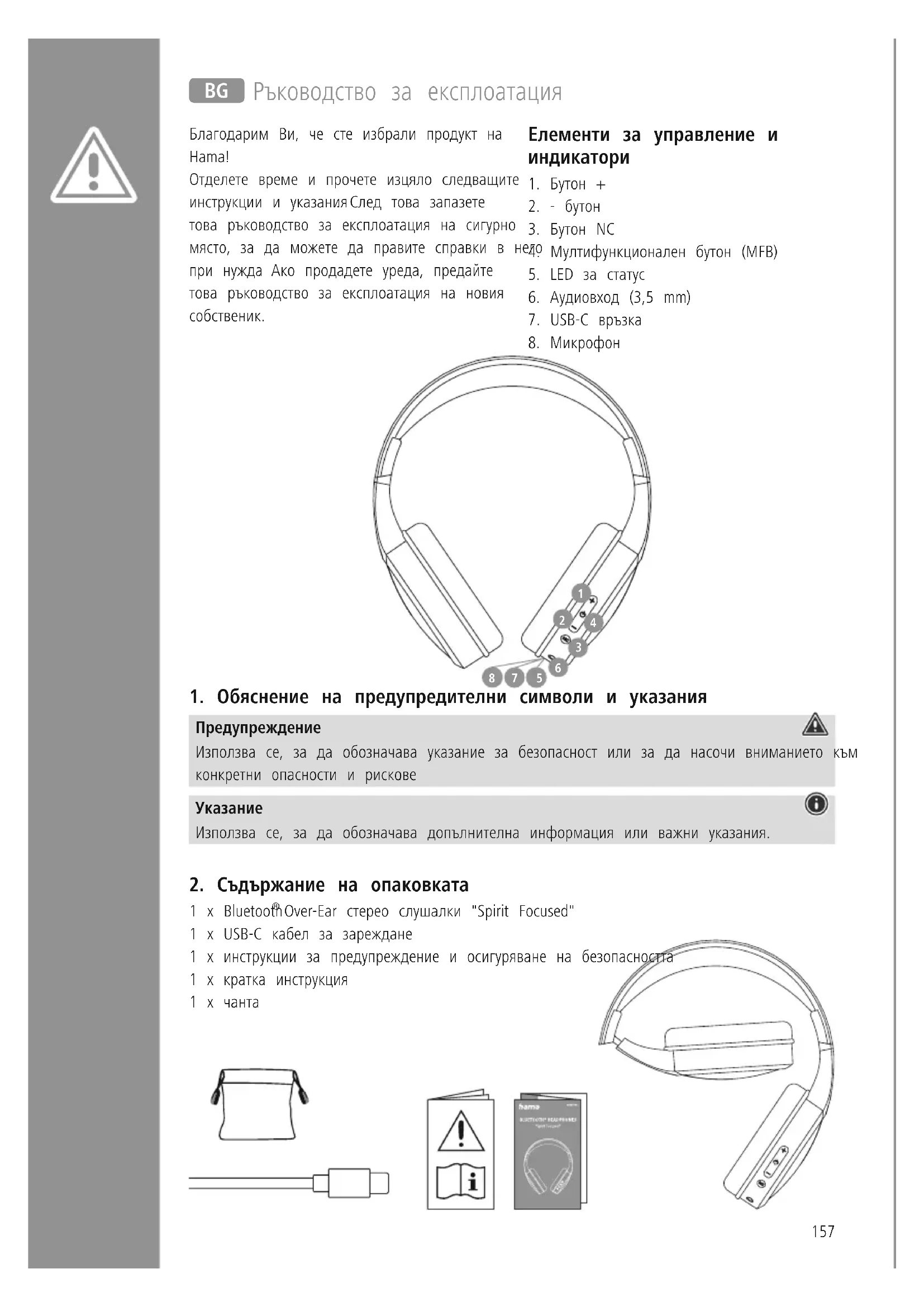 Over-Ear стерео слушалки "Spirit Focused" 1 x USB-C кабел за зареждане 1 x инструкции за предупреждение и осигуряване на безопасността 1 x кратка инструкция 1 x чанта158