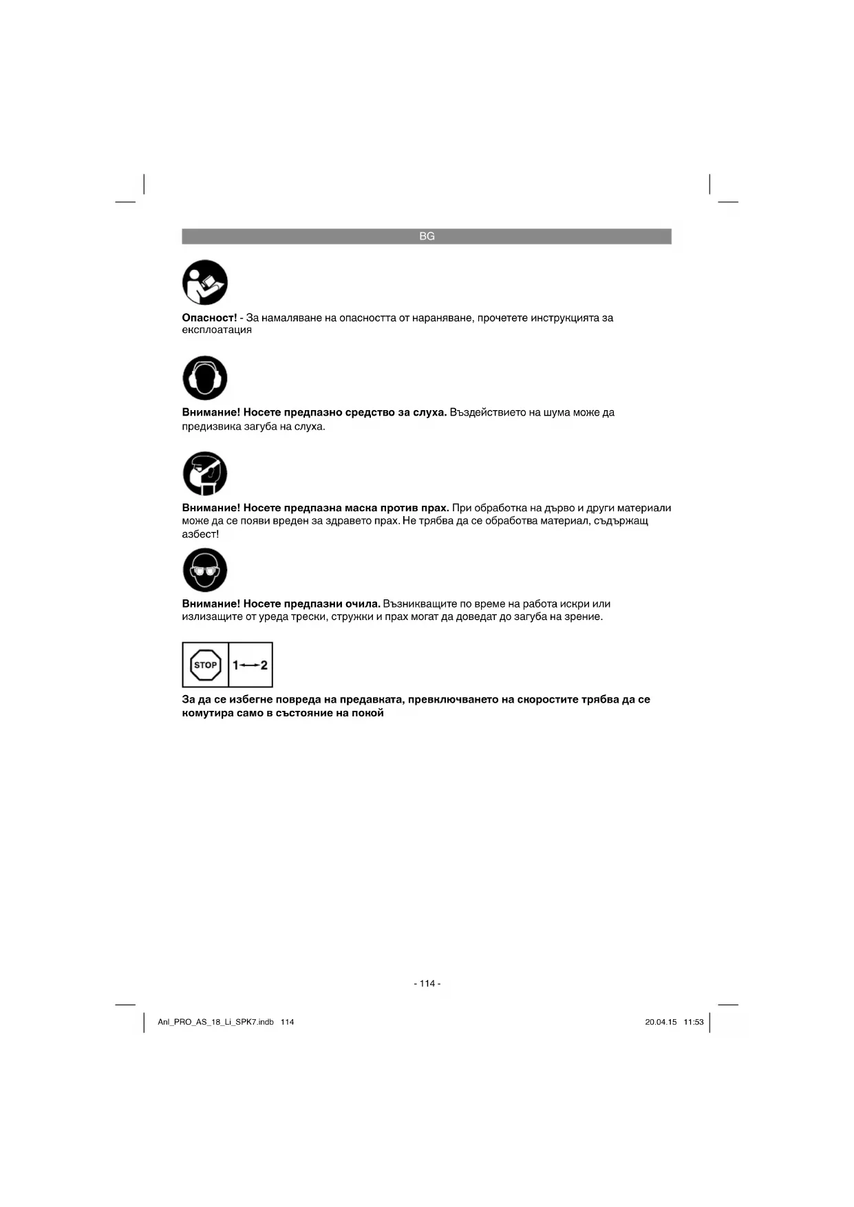 Опасност! - За намаляване на опасността от нараняване, прочетете инструкцията за експлоатация Внимание! Носете предпазно средство за слуха. Въздействието на шума може да предизвика загуба на слуха. Внимание! Носете предпазни очила. Възникващите по време на работа искри или излизащите от уреда трески, стружки и прах могат да доведат до загуба на зрение. Внимание! Носете предпазна маска против прах. При обработка на дърво и други материали може да се появи вреден за здравето прах. Не трябва да се обработва материал, съдържащ