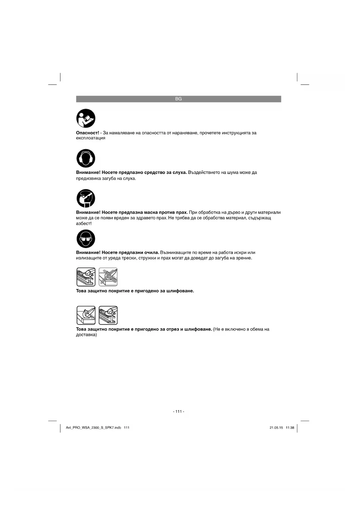 Ъглошлайфът е предназначен за шлифоване на метал и камък като се използва съответният шлифовъчен диск и съответното защитно приспособление. Предупреждение! Ъглошлайфът може да се използва за отрез на метал и камък, само ако е монтирано защитното приспособление, което може да се получи като принадлежност. Машината трябва да се използва само по предназначението й. Всяка по-нататъшна извън това употреба не е по предназначение. За предизвикани от това щети или наранявания от всякакъв вид отговорност носи потребителят/обслужващото лице, а не производителят. Anl_PRO_WSA_2300_S_SPK7.indb 112Anl_PRO_WSA_2300_S_SPK7.indb 112 21.05.15 11:3821.05.15 11:38BG