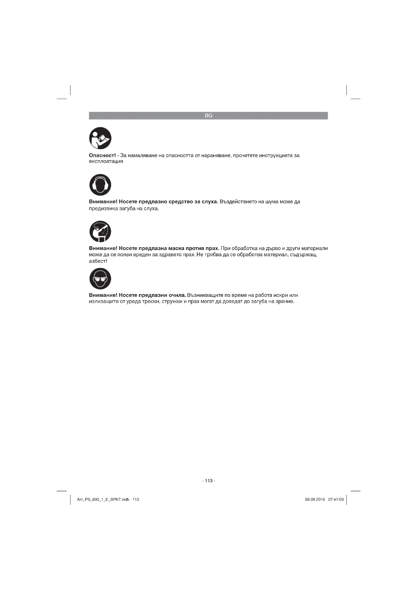 Опасност! - За намаляване на опасността от нараняване, прочетете инструкцията за експлоатация Внимание! Носете предпазно средство за слуха. Въздействието на шума може да предизвика загуба на слуха. Внимание! Носете предпазни очила. Възникващите по време на работа искри или излизащите от уреда трески, стружки и прах могат да доведат до загуба на зрение. Внимание! Носете предпазна маска против прах. При обработка на дърво и други материали може да се появи вреден за здравето прах. Не трябва да се обработва материал, съдържащ