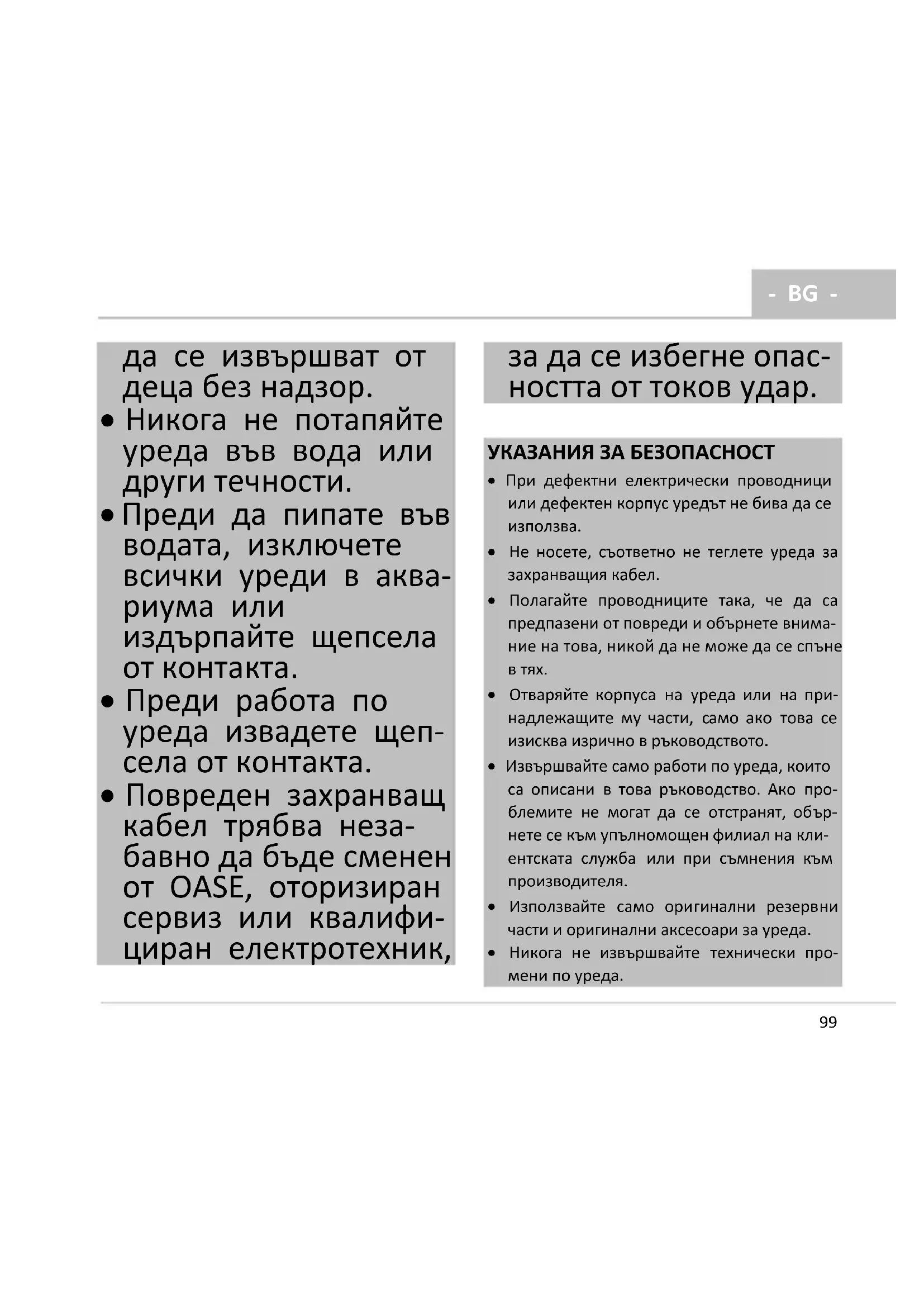 - Повреден захранващ кабел трябва неза- бавно да бъде сменен от OASE, оторизиран сервиз или квалифи- циран електротехник, за да се избегне опас- ността от токов удар. УКАЗАНИЯ ЗА БЕЗОПАСНОСТ