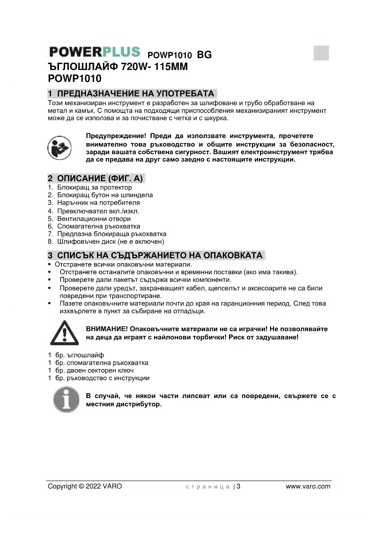 - Не забравяйте да поставяте подложни шайби, ако такива са доставени със съответния абразивен продукт и когато това се налага.POWP1010 BG Copyright © 2022 VARO с т р а н и ц а | 7 www.varo.com